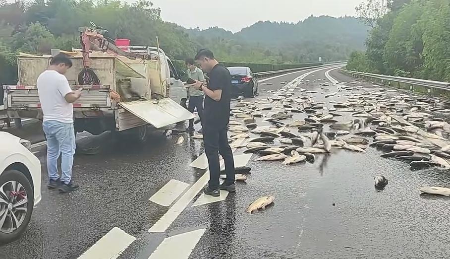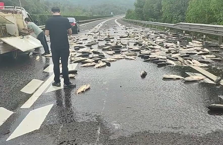 这场景还挺特别的,可是我忘记带电磁炉和锅头了。 国庆高速堵车就算了,还来了这么多鱼“凑热闹”。不知道车主是啥心情,不过也算是高速上难得一见的“风景线”了。 就是清理起来估计得费不少功夫,也希望别影响交通太久。