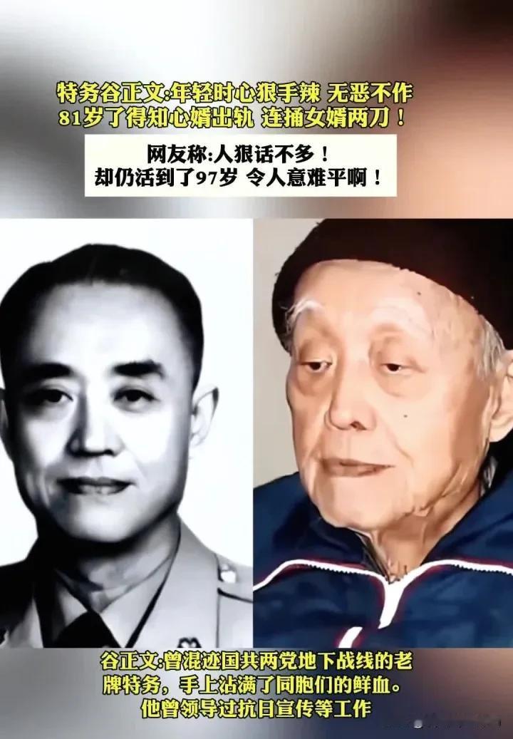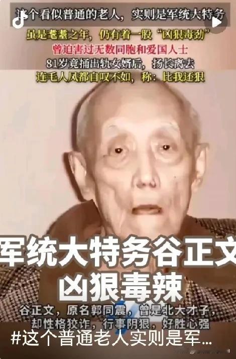这个面部狰狞,杀人不眨眼的老人被称为“活阎王”。他正是北大高材生、军统大特务谷正文。谷正文到底有多么令人心生畏惧。 没人能想到,这个双手沾满鲜血的特务,早年也曾走进过北大校园。他本名郭同震,1910年生于山西汾阳,考入北大后恰逢九一八事变,年轻的他曾投身学生运动,甚至担任过中共北平学生运动委员会书记,还在八路军115师当过大队长。 可抗战前夕执行任务被捕后,他选择了叛变,转身投靠军统,从此踏上一条沾满同胞鲜血的道路。 谷正文的发迹离不开戴笠的赏识。戴笠在日记里明确写下“郭同震读书甚多,才堪大用”,这份评价在戴笠死后被毛人凤发现,让原本平平无奇的他立刻获得重用。 毛人凤对他的畏惧,既源于戴笠留下的评价,更源于他行事毫无底线的狠辣。戴笠死后,毛人凤接任军统局长,许多棘手的脏活累活都交给谷正文,可他从不受规矩束缚,甚至敢在汇报时直接顶撞,毛人凤虽为上级,却因他深得蒋介石信任而不敢真的动他。 当年策划暗杀周恩来的克什米尔公主号事件,手下为50万港币酬劳不敢向毛人凤请示,还是谷正文拍板支持,事后为掩盖行踪,他一句“老先生亲自交办”就逼得机场检查处赵上校丢了官职,这份霸道连毛人凤都自叹不如。 “活阎王”的称号是用无数冤魂堆出来的。退守台湾后,他任保密局上校侦防组组长,主导肃清中共台湾省工作委员会,400多名地下党员被捕,吴石、朱谌之等英烈惨遭迫害。 他策划的鹿窟事件被称为228事件后的又一白色恐怖,直接导致35人被处死,多年后即便他出面平反,也抹不去那些家庭的伤痛。 他还曾奉命暗杀桂系将领白崇禧,两次制造“意外”未果后,又暗中操纵医师加大补药剂量,最终让白崇禧“一补不起”,杀人不见血的手段令人发指。 除此之外,印假钞扰乱大陆经济、策划绑架傅作义、暗杀陆军大学校长杨杰,桩桩件件都是滔天罪行。 家人对他的畏惧,藏着无数寒心的细节。他一生结过四次婚,生下十个儿女,却没有一个愿意留在身边。第三任妻子因他疑心太重,被怀疑下毒,两人彻底决裂;他曾和儿女发生争执时拔枪相向,差点枪杀女儿,这样的恐惧刻进了孩子们的骨子里。 晚年只有养女谷美杏陪在身边,可当他81岁得知养女婿出轨,竟直接持军刀将其捅伤后扬长而去,那份狠劲连家人都彻底寒心。他在家养了10多条狼狗防身,却防不住午夜梦回的噩梦,更防不住亲人的远离。 谷正文晚年活得像个跳梁小丑。他出版回忆录披露“反攻大陆”的内幕,承认那些所谓的渗透行动后期早已沦为闹剧——派特务去大陆看几场电影、拿张火车票根回来就能向蒋介石表功,哄老先生开心。 他还热衷于爆料博眼球,一会说邓丽君是情报人员,一会称蒋经国情人是被谋杀,甚至公开指认大儿子涉案尹清枫命案,可检调单位根本不采信,反倒落得个“大义灭亲”的笑话。 97岁的他因多重器官衰竭病逝在台北医院,身边只有养女送行,连个亲生儿女的影子都没有。 谷正文的一生,是从北大才子到叛国特务的堕落史。他把才智用在害人上,把狠辣当本事,即便高寿也难逃晚景凄凉。历史从不会放过任何作恶者,他的名字早已被钉在耻辱柱上,成为永远的反面教材。 各位读者你们怎么看?欢迎在评论区讨论。