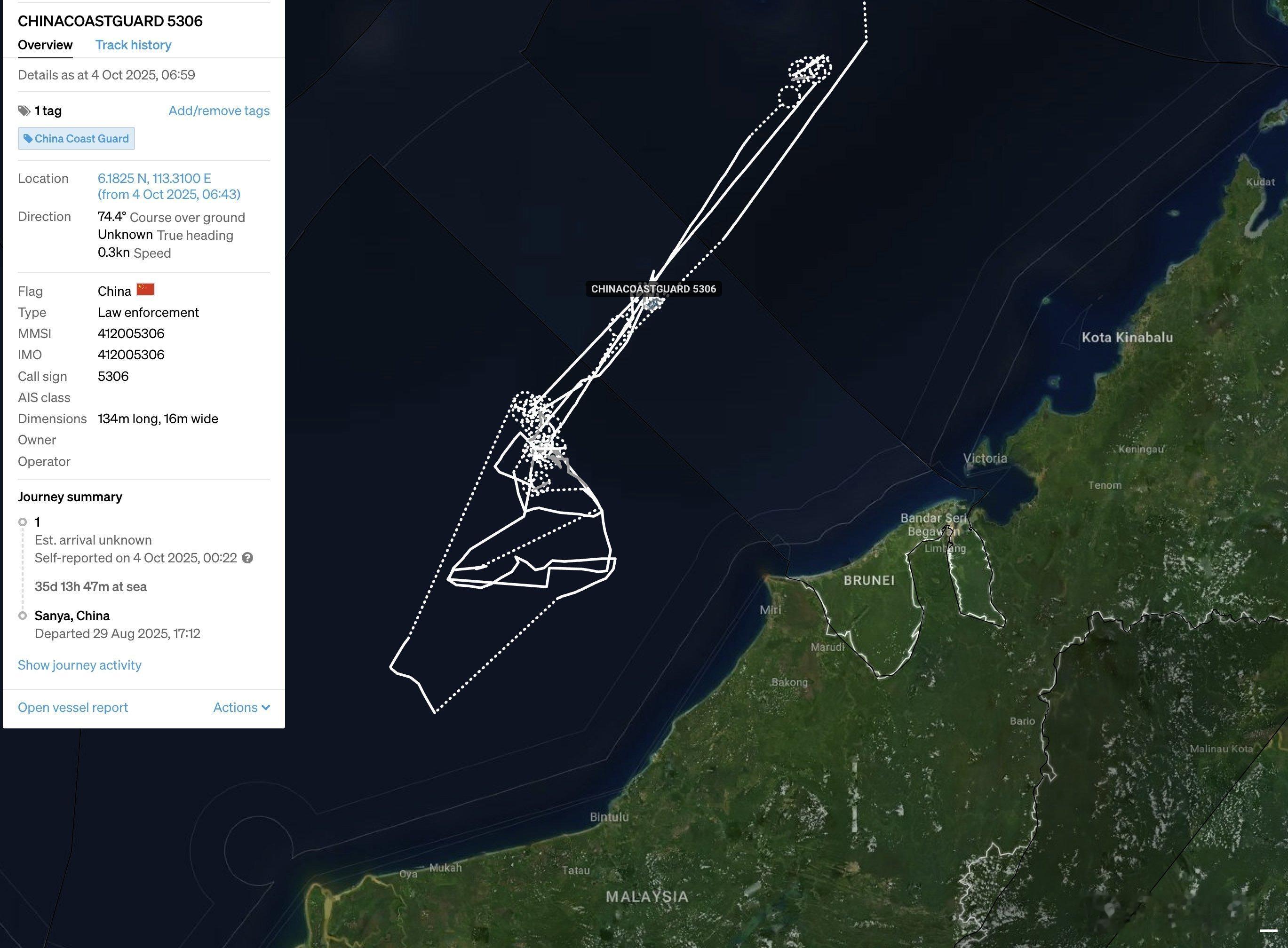 中国海警5306舰国庆节后开始在南海西南海域巡航,包括曾母暗沙、南北康暗沙、南通礁、安渡滩等海域。这也是海警5306舰首次在南海西南海域巡航。