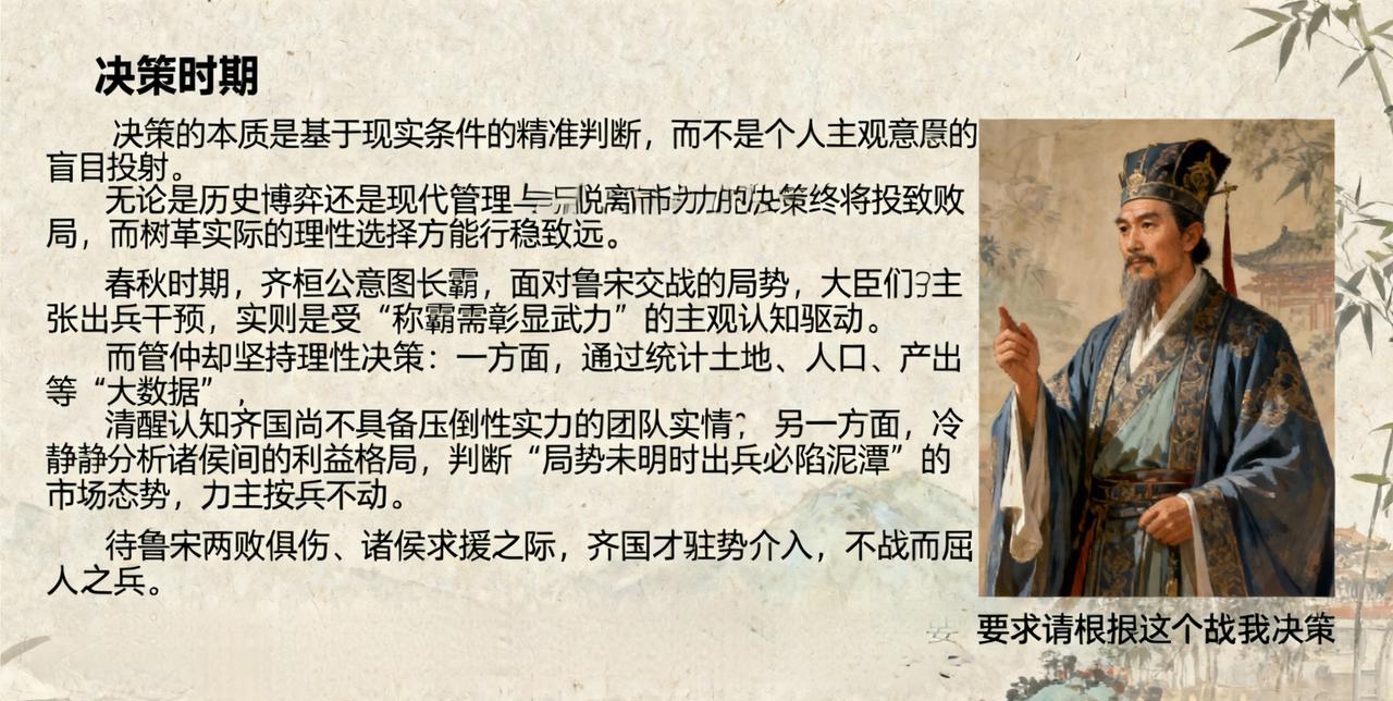 中小企业为什么总做不大第二个主要原因:决策脱离市场。 做一些市场决策的时候,其本质是基于现实条件的精准判断,并不是你老板个人主观意志的盲目决定。 我们可以从历史故事中寻找蛛丝马迹,顶级的市场智慧在东方而非西方的条条框框,春秋战国时期,齐桓公意图称霸,面对鲁宋交战的局势,大臣们纷纷主张出兵干预,实则是受“称霸需彰显武力”的主观认知驱动,而管仲却坚守理性决策:一方面,通过统计土地、人口、产出等“大数据”,清醒认知齐国尚不具备压倒性实力的团队实情,另一方面,冷静分析诸侯间的利益格局,判断“局势未明时出兵必陷泥潭”的市场态势,力主按兵不动,等到鲁宋两败俱伤、诸侯求援的时候,齐国才趁势介入,没有出兵就赢得了市场,正是这种贴合实际的决策,让齐国逐步积蓄力量,最终成为春秋五霸之首,这就是“据实情决策”的正确性。
