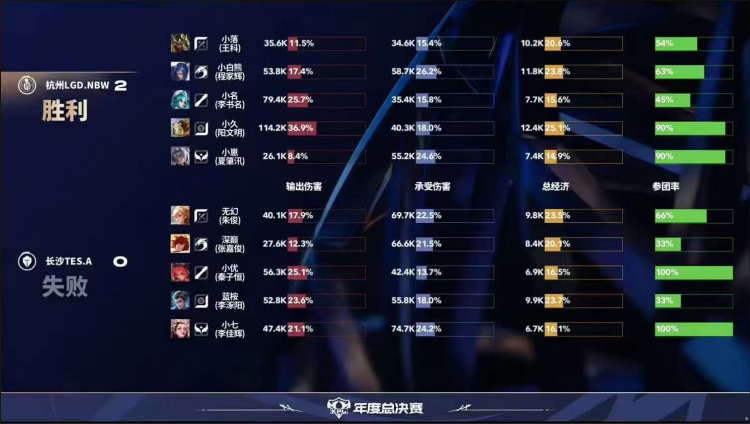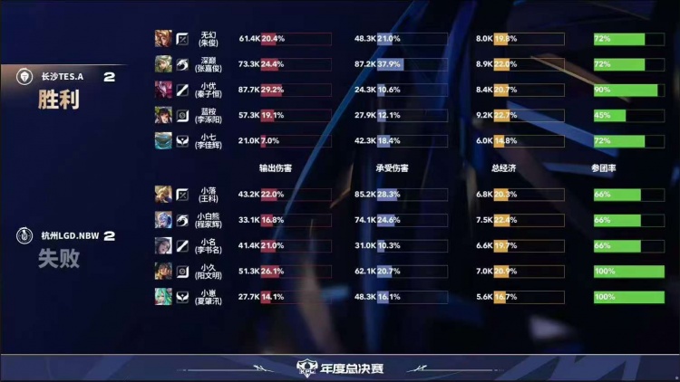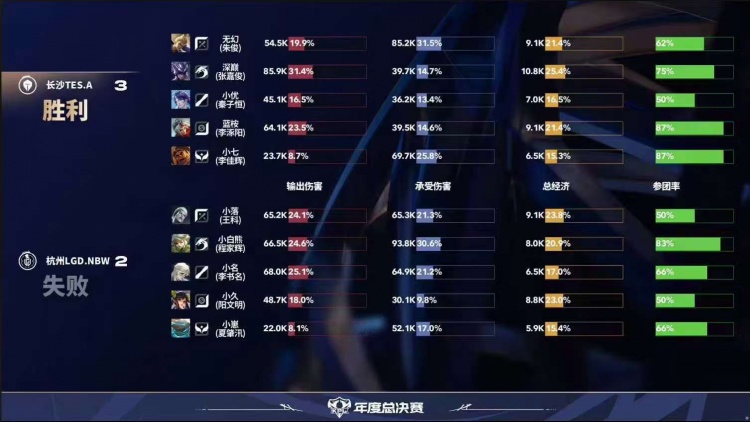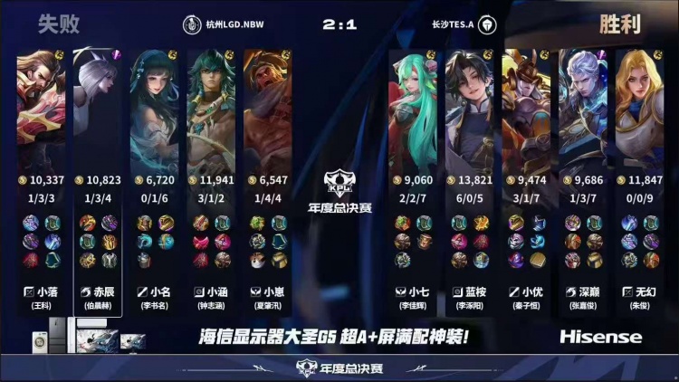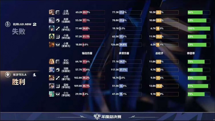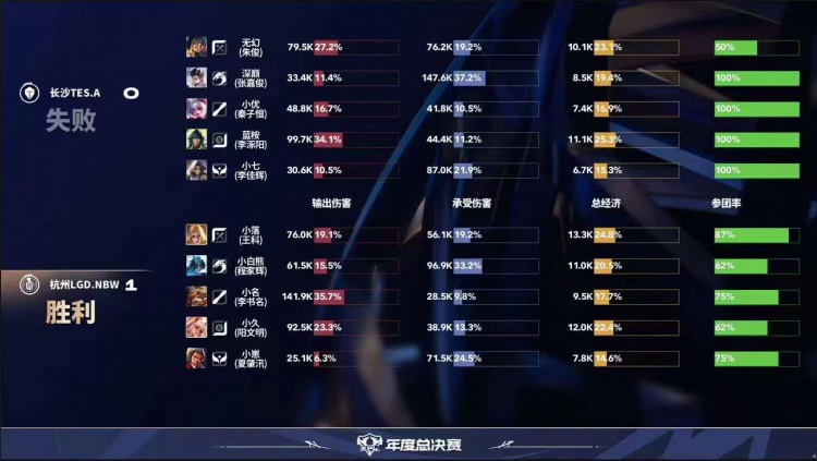 直播吧10月5日讯2025KPL年度总决赛本场比赛是由杭州LGD.NBW对阵到长沙TES.A!第一局:LGD凭借夏洛特个人发挥成功打出多波掉点,15分钟LGD打赢团战成功点掉水晶拿下胜利!第二局:LGD前期入侵野区完成压制,LGD不断扩大优势成功推掉水晶先拿赛点!第三局:LGD前期拿到优势,19分布在龙团TES打出1换4,随后TES成功完成逆转翻盘!第四局:TES前期入侵野区帮助干将完成超前发育,中期干将输出导致LGD完全无法接团,TES拿下胜利!第五局:LGD前期拿到优势,但是TES成功帮助马超发育成型,后期团战马超一人carry全场成功帮助TES完成让二追三!