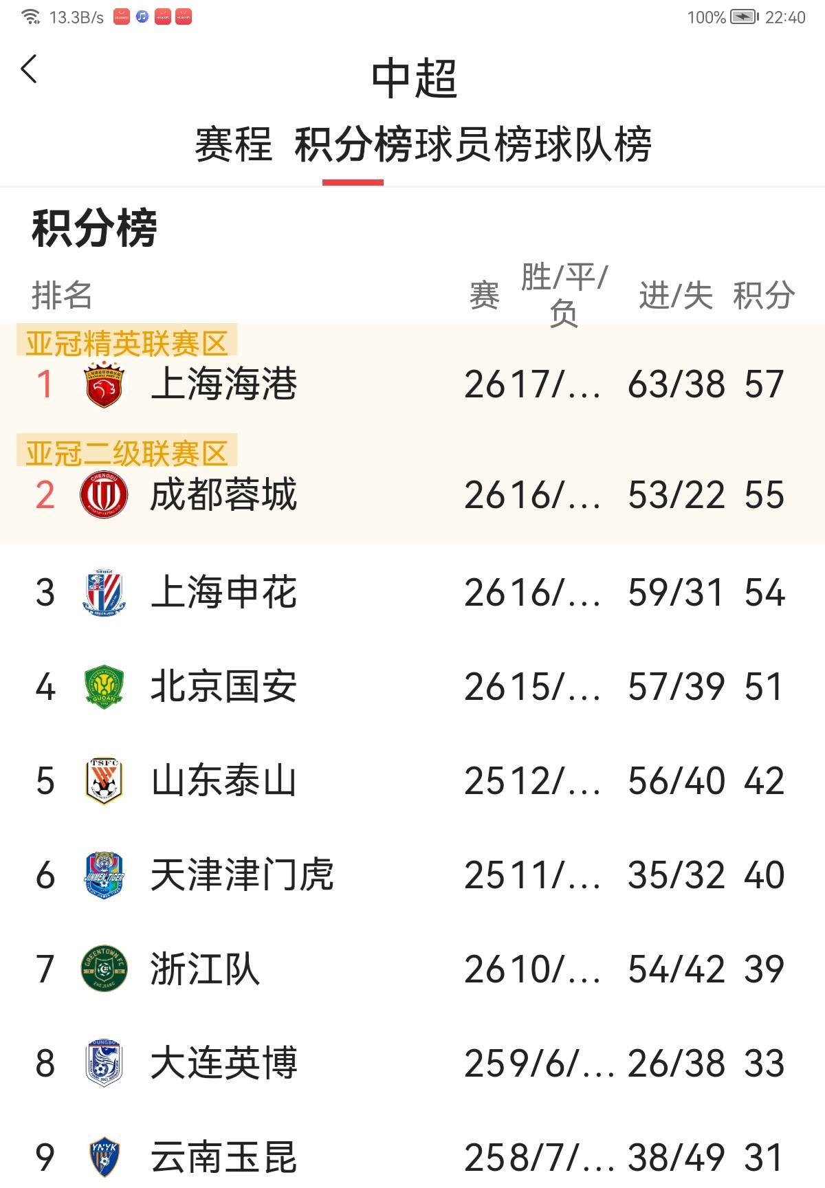 蓉城第一,申花第二。上港虽然现在第一,但后面还要碰山东浙江,夺冠概率反面最低,当然这只是预测。