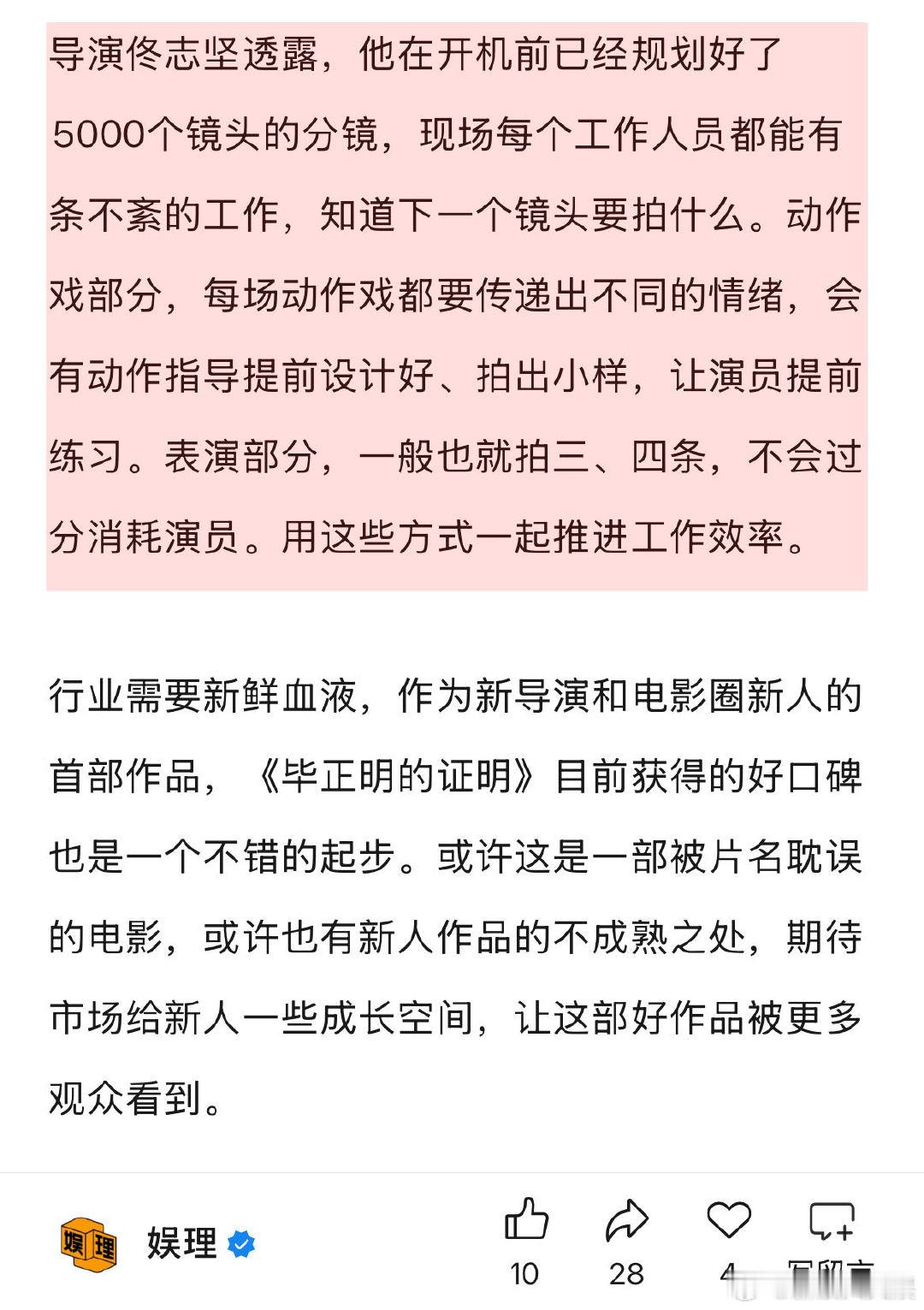 导演说选王安宇是选对人了 毕正明的导演谈王安宇的破碎感 《毕正明的证明》去年年底开机,今年国庆上映,有不错的效率。导演佟志坚透露,他在开机前已经规划好了5000个镜头的分镜,现场每个工作人员都知道下一个镜头要拍什么。动作戏部分会让演员提前练习。表演部分一般也就拍三、四条,不会过分消耗演员…娱理独家↓