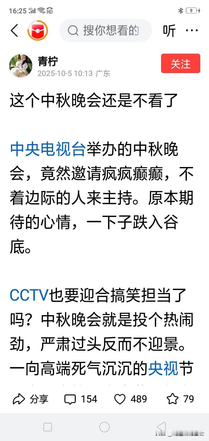 你会看谢娜参与主持的央视中秋晚会吗?! 央视官宣,今年央视中秋晚会中的女主持人唯二中的之一,便是被观众轰下停开的,原湖南卫视最著名的《快乐大本营》主持之一的谢娜! 谢娜回应说,她″不敢相信”央视会请她主持央视中秋晚会,当然这是演戏作秀的套路操作,作不得真的,里面的条条款款早在500年前就已经完美协商好了的。 看了看网络上的反应,没有想到竟然是绝绝子的反对央视的如此戏宣,表示只要谢娜主持,他们都会拒看央视的中秋晚会。至于是真是假就不得而知了。 反正我自己是不会看央视今年的中秋晚会!因为它们是大喉咙,它们的尝试别人指点不指点都没有丝毫影响,而且谁也惹不起它们,惹不起总躲得起嘛。 明天就是中秋了,也不知你还有兴趣去看央视中秋晚会吗?