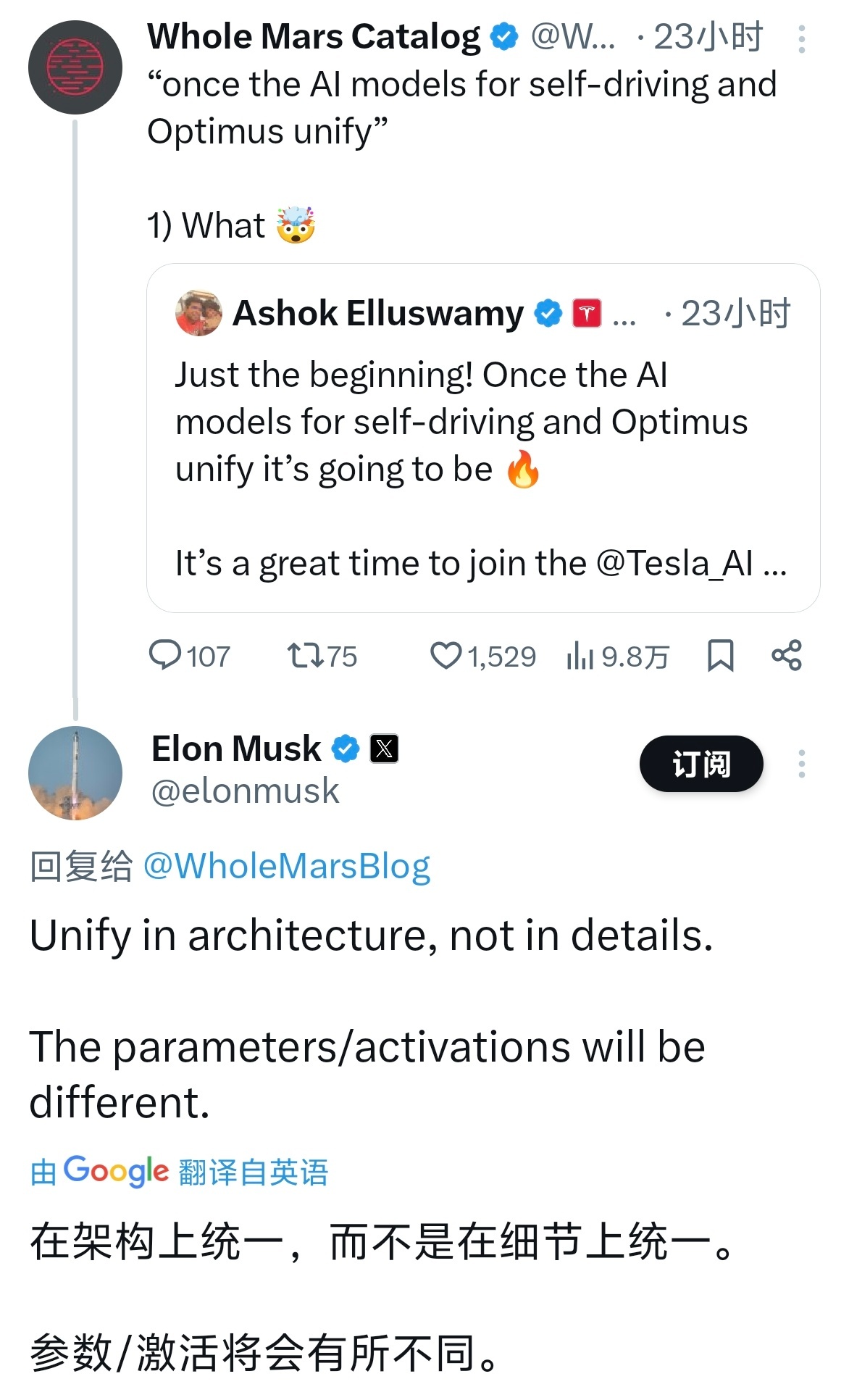 特斯拉计划接下来统一 FSD 模型和 Optimus 机器人模型的架构,依场景按需激活不同的参数。听起来这是一个典型的 MOE 架构的用法。