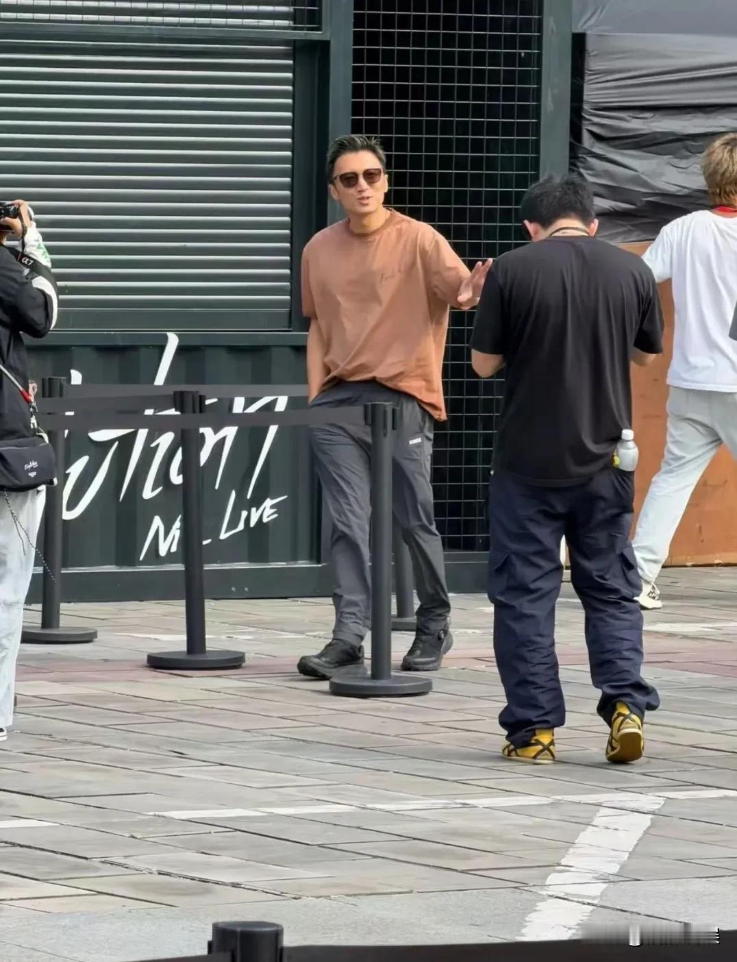 谢霆锋现身重庆,为即将到来的演唱会做准备。 他戴着墨镜,穿着月饼色T恤黑色长裤,