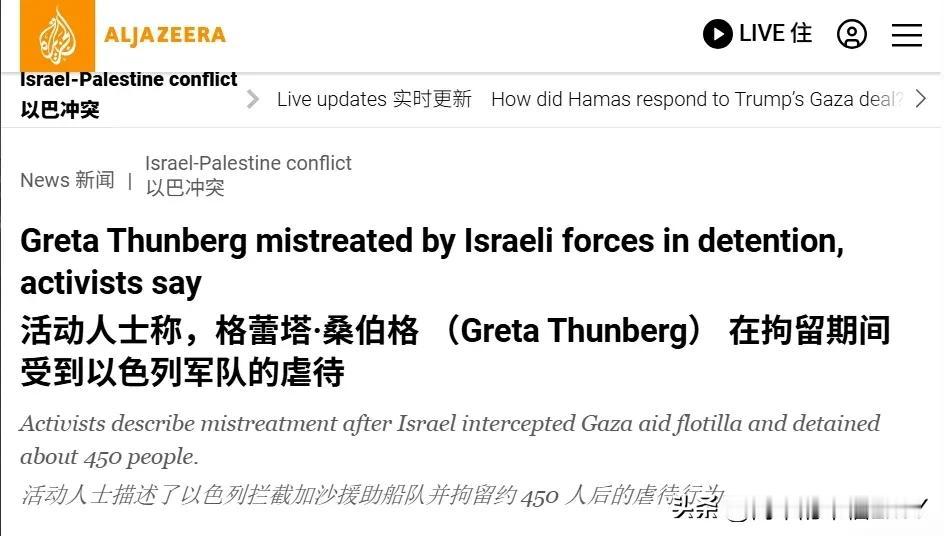 环保少女”被逼亲吻以色列国旗!10月4日以色列释放了加沙救援船队的100多名人员,但著名的“环保少女”格蕾塔·通贝里并不在其中。 根据多名参与救援船队、来自土耳其、意大利和马来西亚志愿者的说法,他们亲眼目睹了以军士兵殴打格蕾塔·通贝里,在地面上拖行,并逼迫格蕾塔亲吻以色列国旗。 这哪里是对待和平活动家的方式?分明是用暴力践踏尊严的野蛮行径。另一位土耳其记者的控诉更揭露了扣押期间的非人待遇。他说以军把志愿者们“当成狗一样对待”,既不给食物,也不提供干净的淡水。 绝望之下,他们只能靠喝厕所里的水维持生命。这些本为传递善意而来的国际人士,没料到会亲身经历加沙民众日常承受的苦难。这场突如其来的磨难,让他们对加沙的人道主义危机有了切肤之痛——那些新闻里的数字与描述,此刻都化作了亲身感受的饥饿、干渴与恐惧。 以色列的暴力行为并非偶然,其背后藏着一套屡试不爽的舆论操控术。长久以来,这个国家习惯将国际社会的批评扭曲为“反犹主义”,仿佛只要搬出纳粹大屠杀受害者的身份,就能为所欲为。 在他们的逻辑里,犹太人曾遭受苦难,便意味着以色列可以对巴勒斯坦人肆意施暴,谁站出来反对,谁就是“反犹”。这种将历史创伤转化为施暴特权的做法,真的站得住脚吗? 明眼人都看得清楚,以色列在加沙的所作所为,早已超越了所谓“打击恐怖主义”和“自卫”的范畴。自2023年10月本轮巴以冲突爆发以来,加沙地带已有超过6.6万人丧生。 无数家园被毁,粮食、药品、水源全面告急,这分明是公开的种族灭绝,是蓄意制造的人道主义灾难。当加沙儿童因缺水而嘴唇干裂,当孕妇在废墟中分娩,以色列所谓的“自卫”,不过是施暴的遮羞布。 “全球坚韧船队”的行动,本是一场跨越国界的善意之举。这支由47艘船、500多名多国活动人士组成的船队,带着人道主义物资试图突破封锁进入加沙,却在10月1日深夜遭到以色列海军的突袭。 以军先是干扰船队通信,再用高压水炮攻击,甚至故意冲撞船只,最终扣押了所有人员,将船只拖至阿什杜德港。格蕾塔·通贝里参与其中,正是西方民间力量对以色列舆论操控的反抗。 他们不想再任由真相被掩盖,不想再看着暴行被美化。以色列或许以为暴力能压制反抗,却没想过此举只会加速自身道德破产。要知道,以军的暴行早已激起西方民间的强烈反感。 从街头抗议到舆论声讨,越来越多的西方人看清了以色列的真面目。这次对格蕾塔的施暴,更是犯了众怒——她并非武装人员,只是一位呼吁和平与人道的活动家,如此对待她,与恃强凌弱有何区别? 国际社会的谴责早已铺天盖地。南非、卡塔尔、比利时等多国纷纷发声,指责以色列违反国际法,要求立即放人。哥伦比亚更是直接驱逐以色列全部外交人员,用实际行动表达抗议。 就连多个西方国家近期也在联合国大会上宣布承认巴勒斯坦国,这本身就是对以色列的无声批评。以色列自己的说法则漏洞百出,以外交部声称所有被扣押人员“安全且健康状况良好”,可志愿者们“喝厕所水”的控诉,直接戳破了这个谎言。 以方还指认船队与哈马斯有关联,这种没有实据的指控,不过是为施暴找借口。更讽刺的是,以色列总理内塔尼亚胡竟还对拦截行动表示赞赏,称阻止了船只“进入战区”,仿佛向饥饿的民众运送物资是什么十恶不赦的罪行。 现在所有人都在盯着以色列:对格蕾塔·通贝里,他们究竟打算如何收场?放了她,暴力施虐的事实已无法抹去;一直关押,只会持续点燃国际怒火;若真如外界担忧的出现“意外死亡”,更会彻底引爆舆论。 无论选哪条路,以色列都在耗尽自己在欧洲仅存的最后一点道德优势。毕竟,道德从来不是靠强权维系的,而是靠尊重生命、坚守底线赢得的。 这场风波更让世人看清一个道理:用历史创伤为暴行辩护,只会让创伤本身蒙羞;靠暴力压制不同声音,终究会被声音淹没。加沙的苦难还在继续,国际社会的关注不该降温。 格蕾塔·通贝里的遭遇,不过是加沙人道主义危机的一个缩影——那些在封锁中死去的平民,那些失去家园的孩子,他们的痛苦远比个体遭遇更值得被看见。 以色列的道德假面已经裂开,再难拼凑完整。接下来的每一步,都将写进历史的审判簿。而对我们所有人而言,记住这场风波,记住加沙的苦难,便是对和平最基本的坚守。