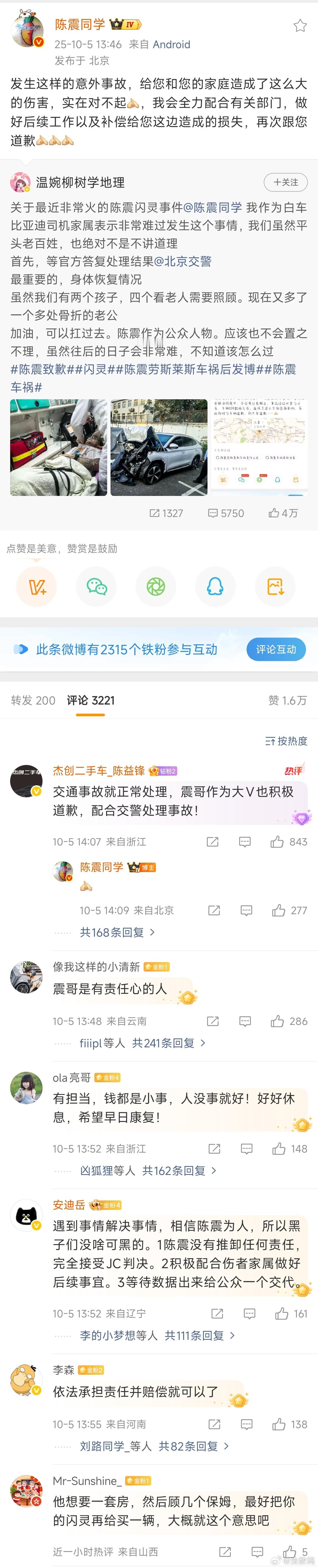 看陈震的微博评论,感觉陈震才是本次事故的受害者。[允悲]