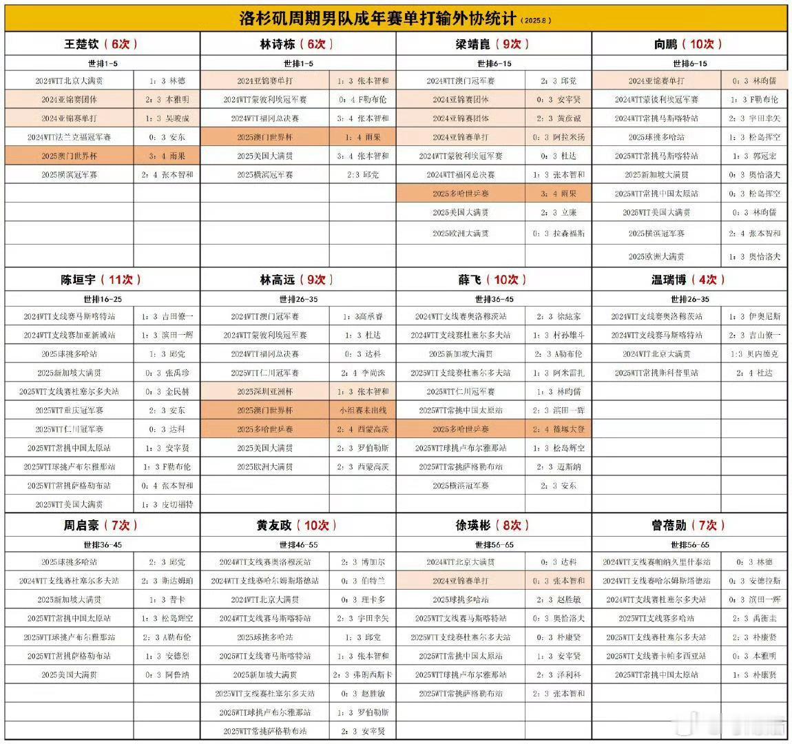 本来想求一个洛杉矶周期国乒男队输外协记录表格,结果发现更新太频繁了,感觉制图的跟不上们乒男输球的速度[允悲](这个表是截止到欧洲大满贯)