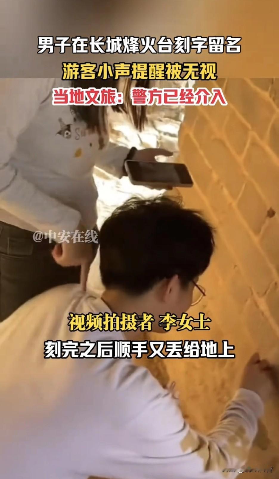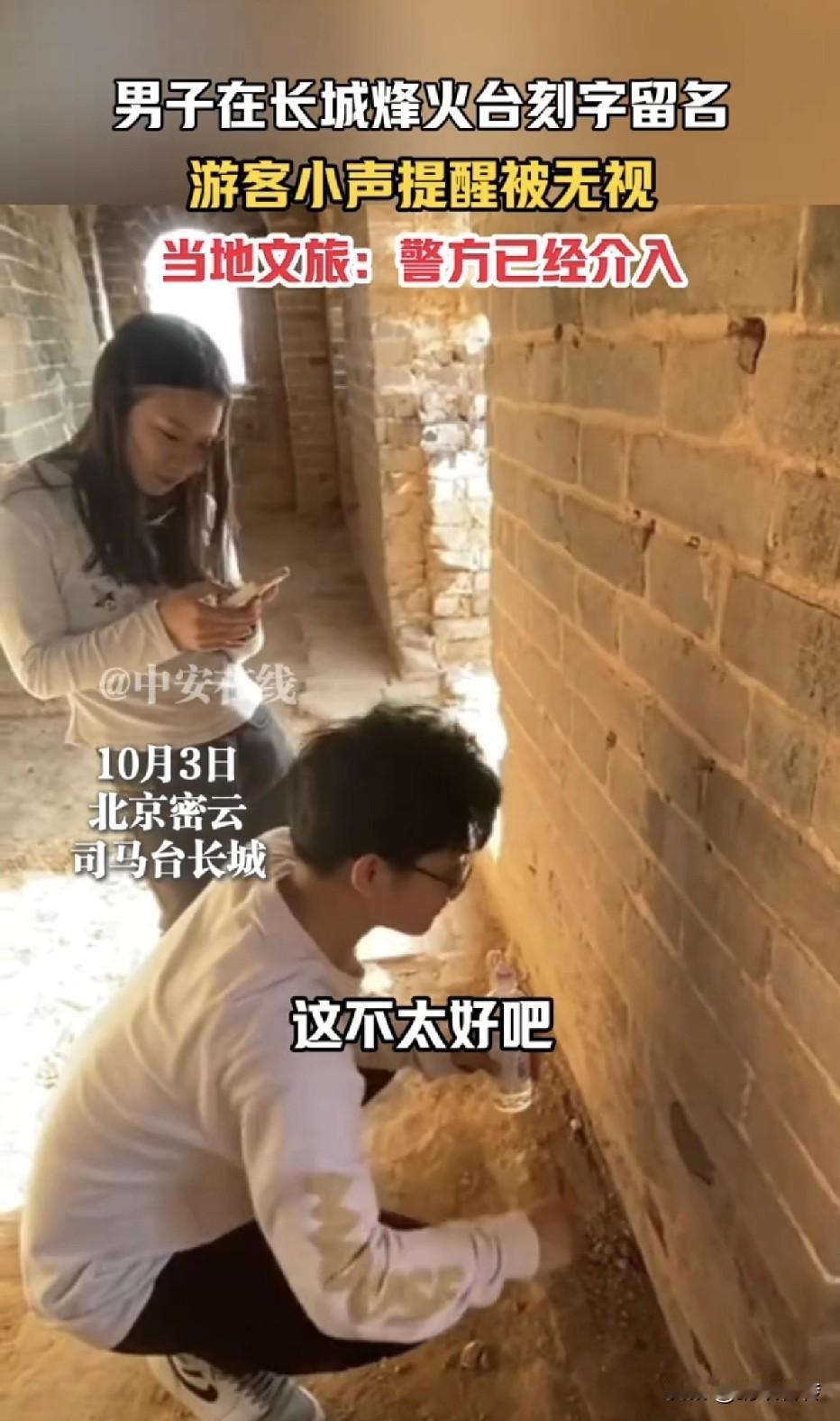 10月3日。两个年轻人在司马台长城景区游玩时,在墙体上刻下两人的名字和图案,报应来的就是这么快,最终二人被依法拘留。 这都什么年代了,还有这么愚蠢的人吗?走哪都要刻上到此一游,这不是留念,这是遗臭万年。两个年轻人最终为他们的愚蠢付出代价。