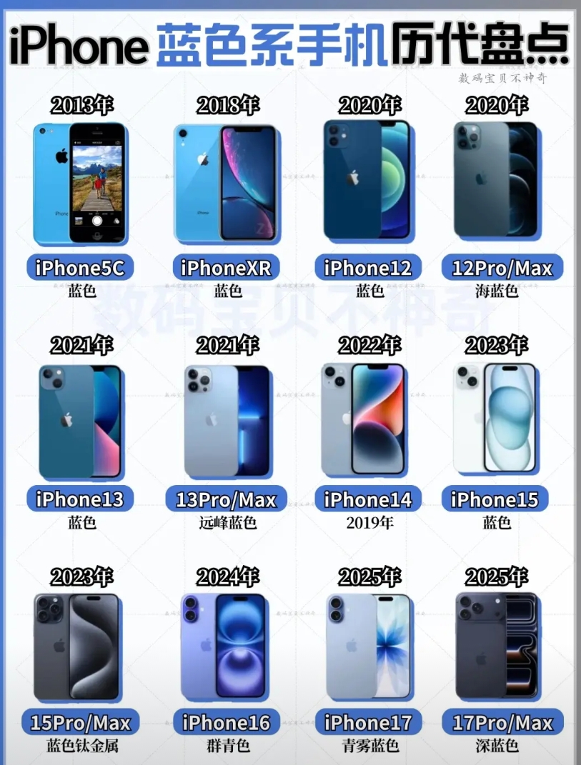 ✅2013年 iPhone5C-蓝色 ✅2018年 iPhoneXR-蓝色 ✅2020年 iPhone12-蓝色 iPhone12Pro/ProMax-海蓝色 ✅2021年 iPhone13-蓝色 iPhone13Pro/ProMax-远峰蓝色 ✅2022年 iPhone14-蓝色 ✅2023年 iPhone15-蓝色 iPhone15Pro/ProMax-蓝色钛金属 ✅2024年 iPhone16-群青色 ✅2025年 iPhone17-青雾蓝色 iPhone17Pro/ProMax-深蓝色 近几代你更喜欢哪款蓝色? 友友们,如果有问题欢迎在评论区一起探讨~