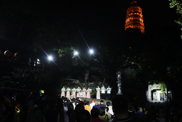 当晚19时30分,千人石至二仙亭区域化身为露天剧场。在优秀青年演员殷立人的解说中,开幕演出在幔亭曲社演绎的《长生殿·定情》[念奴娇序]中开场,悠扬的水磨腔在夜空中回荡。深圳市福田CBD青年昆曲社团张进联带来的《牡丹亭·寻梦》[嘉庆子][尹令],以细腻婉转的唱腔再现杜丽娘的闺阁情思,赢得满堂喝彩。