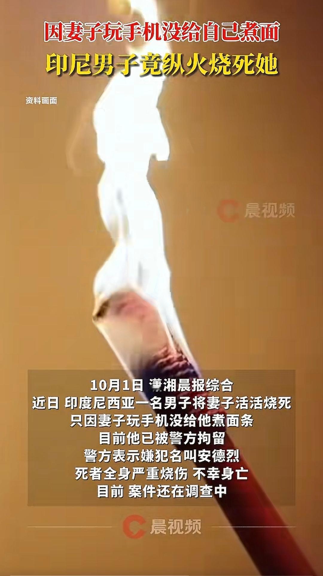 就因为妻子玩手机没给他煮面条,这位印尼男子就将妻子活活烧死。双方发生争执后妻子就已经逃至母亲家中,但该男子追至岳母家,将妻子活活烧死。死者全身严重烧伤,经抢救无效身亡。 太狠毒了,竟然为了这么点小事,何况还是自己的妻子,简直丧尽天良。能娶到媳妇已经很不错了,还不珍惜。 在印尼,印度这些国家女性地位低下很常见 有很多娶到手的媳妇被打,被烧的案件,已经见怪不怪了