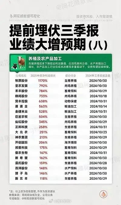 特点: 多个养殖和农产品细分领域业绩增速惊人,尤其是生猪与肉鸡养殖企业,三季报披露日期多在10月底。