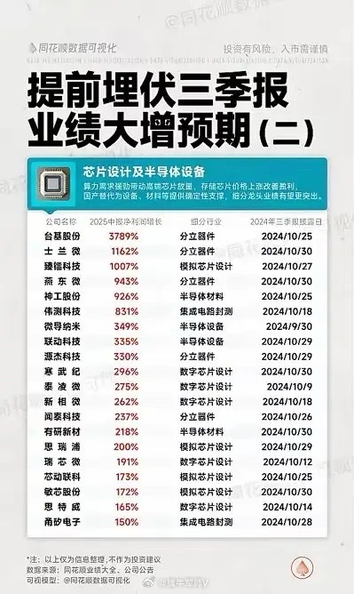 特点: 芯片类企业中报净利润增速极为亮眼,部分封测、设备公司也表现突出,三季报披露日期多在10月下旬。