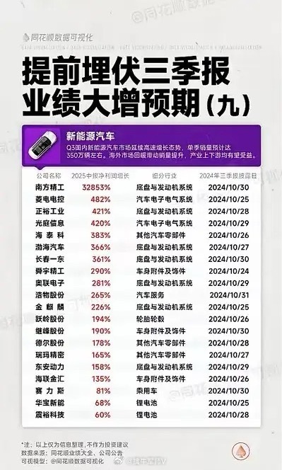 特点: 新能源汽车及产业链上游、零部件企业业绩增长极为突出,部分公司中报净利润增速超万倍,三季报披露多在10月底。