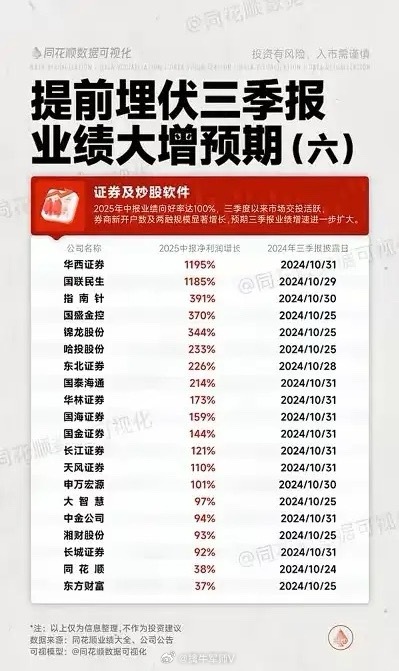 重点公司: 华西证券(1195%)、国联民生(1185%)、指南针(391%)、国盛金控(370%)、锦龙股份(344%)等
