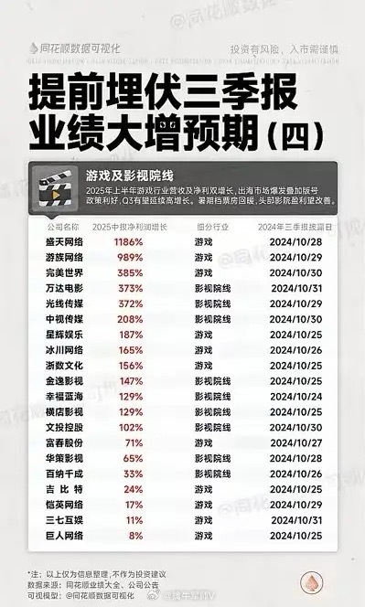 特点: 游戏公司普遍增速极高,影视院线头部企业也有亮眼表现,三季报披露日期分布在10月底至11月初。