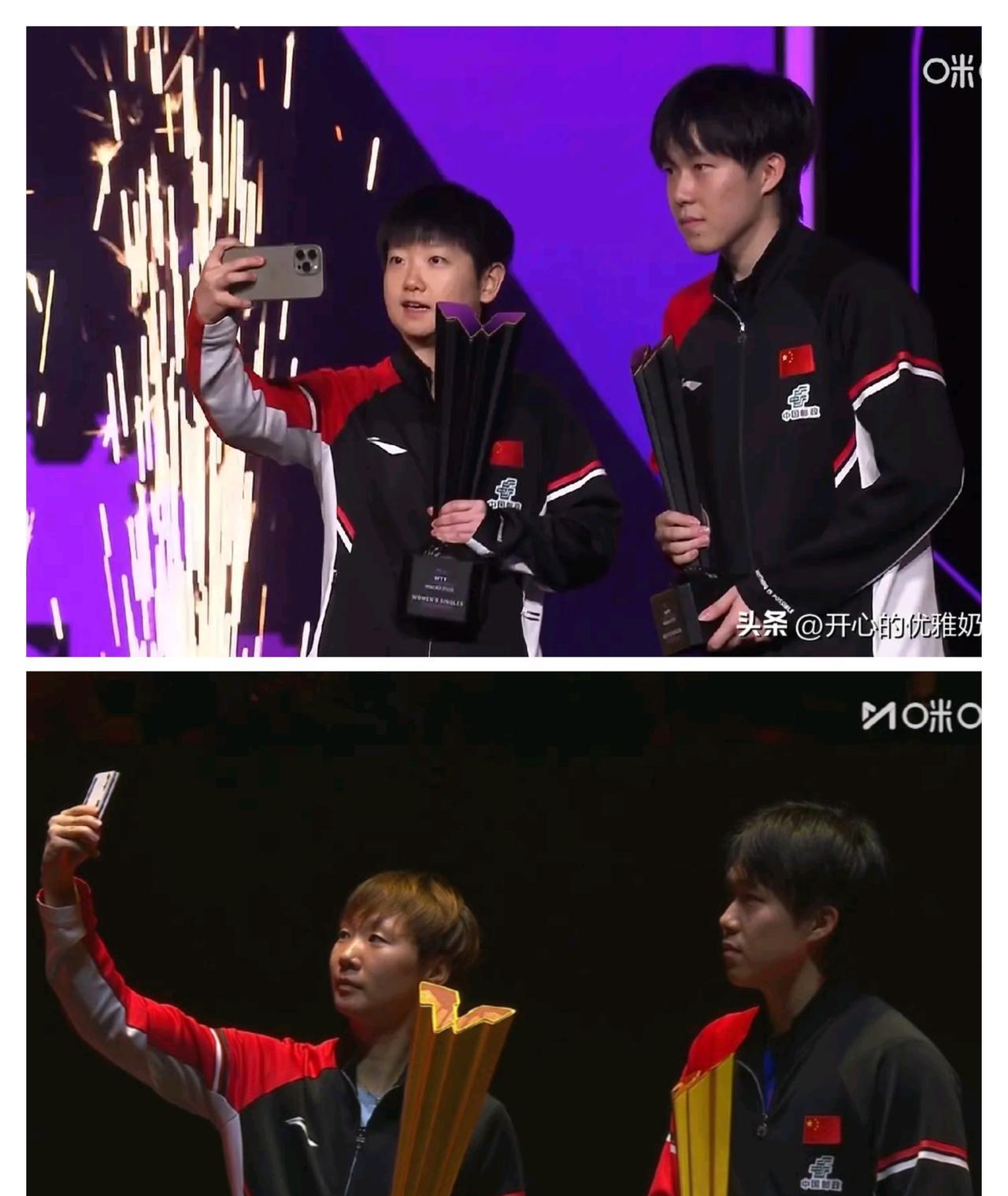北京大满贯, 没能实现顶峰相见。 男单女单冠军自拍, 明显有距离和不开心, 这应该就是遗憾吧。 有遗憾才会有动力, 去年北京大满贯, 也没能实现顶峰相见, 男单和女单冠军合照 是孙颖莎和林诗栋。 今年在国内的顶峰相见, 就是在重庆冠军赛。 只能期待明年北京大满贯 一定可以圆满实现。 图片来自网络侵权可删。