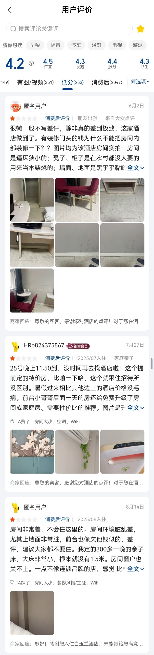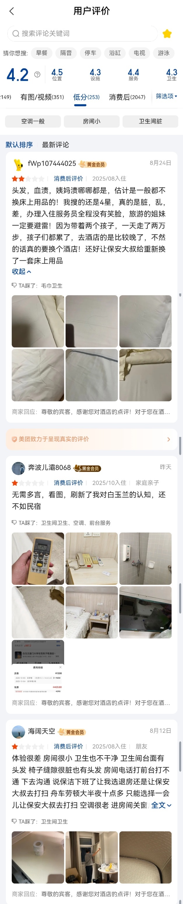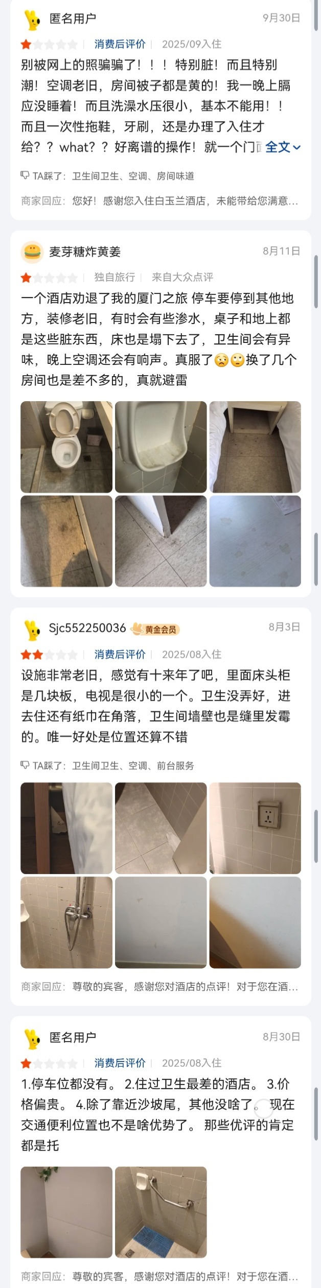 第一次来厦门,就被彻底坑和恶心到了。我订了一个靠近厦门大学的白玉兰酒店,房型是商务房B,结果进去看房间超级差,不是一般的脏乱和破旧,简直比很多普通民宿的卫生状况和设施条件都要差,跟美团上酒店相册的图片更是完全不符。前台跟我说交一个49元的锦江之星会员费,就可以“免费”帮我把房型升级为9楼以上的亲子套房。我说要退房,决定不住了,前台告诉我她不能操作,于是我来来回回联系了美团客服一个多小时,才把这个房给退了。现场还有好几个同样被坑了要求退房的人,大家好好的厦门之行,还没开始就被恶心和糟蹋掉了。真的希望能严肃处理这样的酒店!