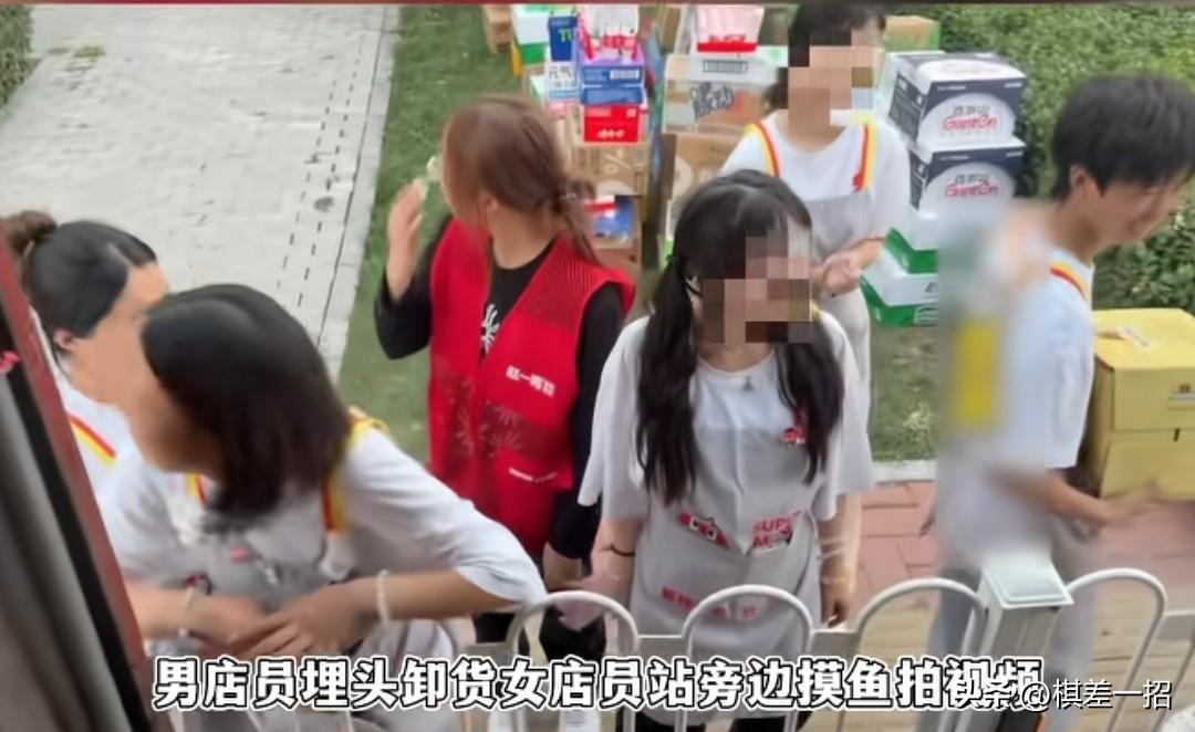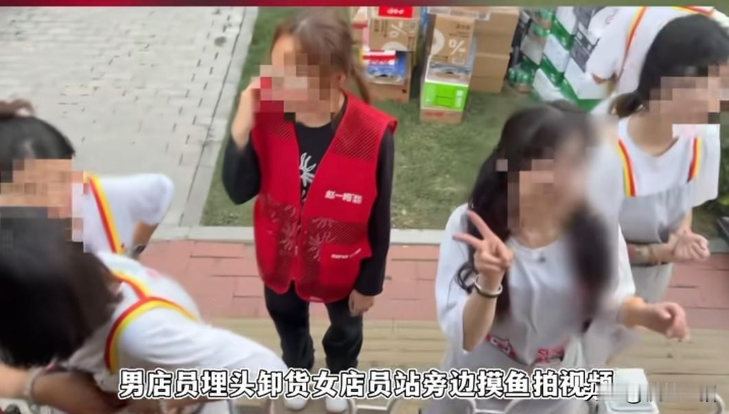 零食店店长拍视频,谁说女的不能干活,拍视频的时候不拍男的,要求男的绕道搬货。 天津赵一鸣零食店,谁说女的不能卸货呢,看我家店员都是女的,正在卸货女店长站在后车厢拍视频,视频里总共有8个人,司机师傅负责站在车厢把货物搬运到车尾,还要小心翼翼闪避女店长镜头,手都快搬出残影了。 男店员埋头搬货,女店员站旁边摸鱼拍视频,两个男店员和一个女店员一直在搬,汗流浃背,1000多件货只有3个人干活,还要被这女店长说要绕开镜头,就为了这一条视频,给他们增加了工作量,另外4个妆容精致的女店员,跟木头桩子一样,看同事干活,嘻嘻哈哈对镜头比耶。 认真干活的四个人没喊累,干了99%的活,功劳全是旁边摆拍同事的,反倒是累坏的,拍视频的店长说几句话就开始大喘气,和男店员搬货的小姑娘是新来的,老实巴交,不会拍马屁,旁边4个老油条跟店长关系好,只需要站在那里浑水摸鱼。