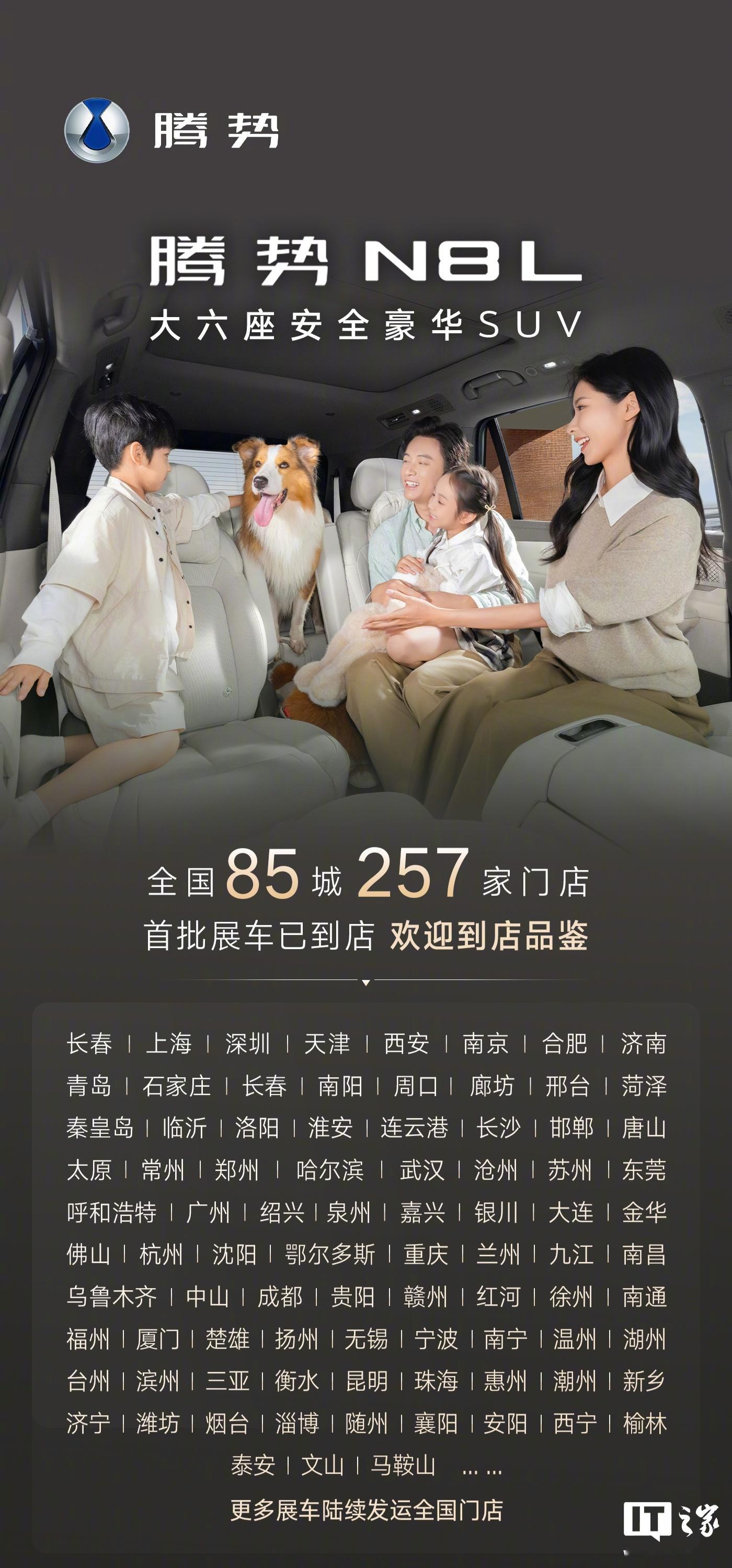 【比亚迪腾势 N8L 大六座 SUV 首批展车抵达全国 85 城 257 家门店,新车预售价 31.98 万元起】腾势汽车官方今日宣布,比亚迪腾势 N8L 大六座 SUV 首批展车在全国 85 城 257 家门店已到店,含长春、上海、深圳、天津、西安、南京、合肥、济南、青岛等城市,新车预售价 31.98 万元起。