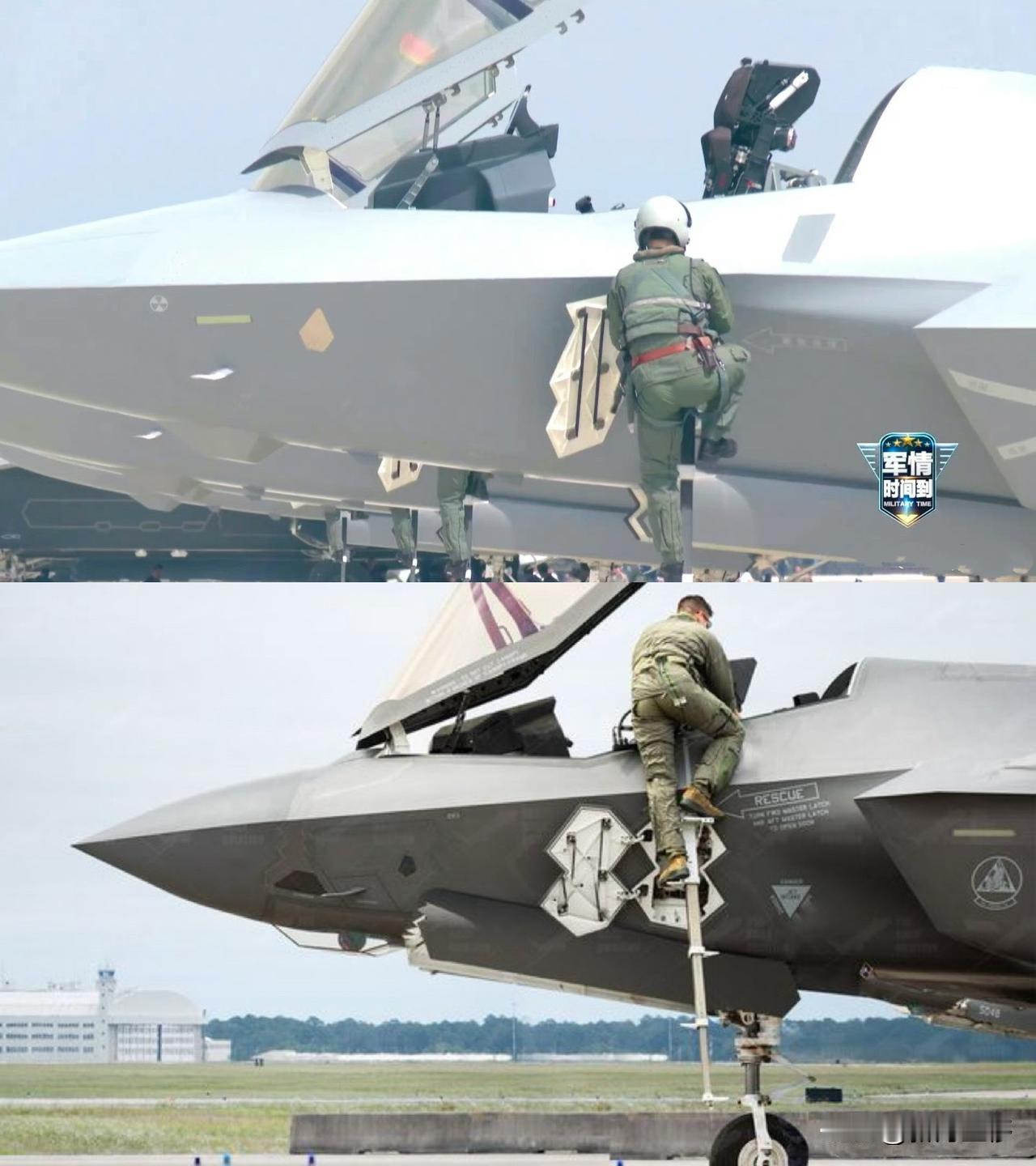 东大和大漂亮的五代机的飞行员登机梯对比,歼35终于也大大方方展出来了。 原来东大的飞机基本靠地勤人员推动移动梯子,供飞行员登机或降机,官方的说法外挂的梯子可以大大降低飞机重量,让飞机可以携带更多的武器或燃料。 其实这个梯子加内部机构,重量应该不高主要是多一个结构,就要多一套可靠性保障。 不过目前东大的技术已经不可往日而语,加这个小梯子应该没什么难度。另外飞机发动机动力已充裕,可以载重更多。