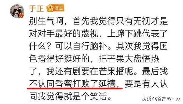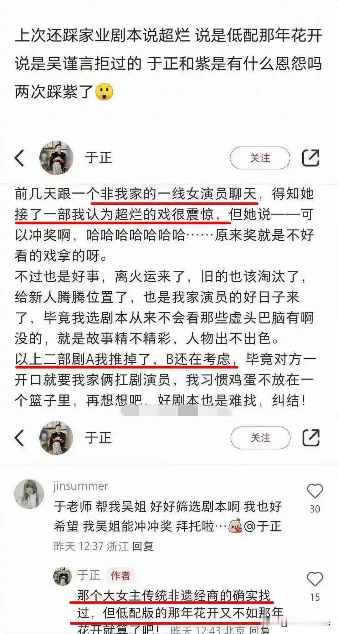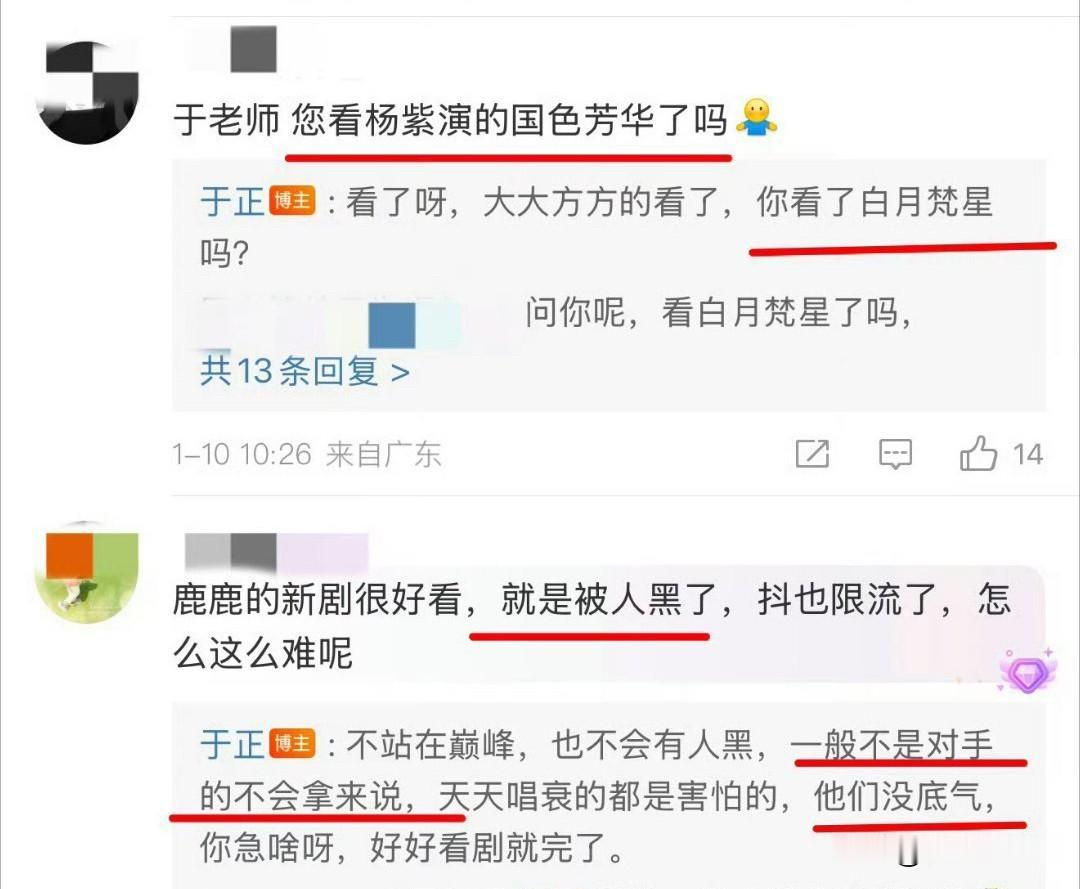 10月5日,于正拉踩杨紫后再度断更,直到今天才发现,原来于正一直在碰瓷杨紫! 多次拿自家剧跟杨紫拼实绩,吐槽《家业》剧本烂,称杨紫接了吴谨言拒演的剧给吴谨言抬咖,同时拉踩杨紫,一次又一次拿他曾经的剧跟杨紫的剧作对比,称不怕比! 真是刚消停两天,又把自己推进了舆论的深渊,杨紫都不带理他的,网友看着都觉得好笑,于正这种行为完全是吃不到葡萄就说葡萄酸,一直拿以前的剧跟现在的剧比,说实话,无论是剧还是人,于正都没法跟杨紫比,于正拍不起杨紫拍的剧,也打造不出第二个杨紫,他只能蹭流,只能嫉妒,嘴碎!