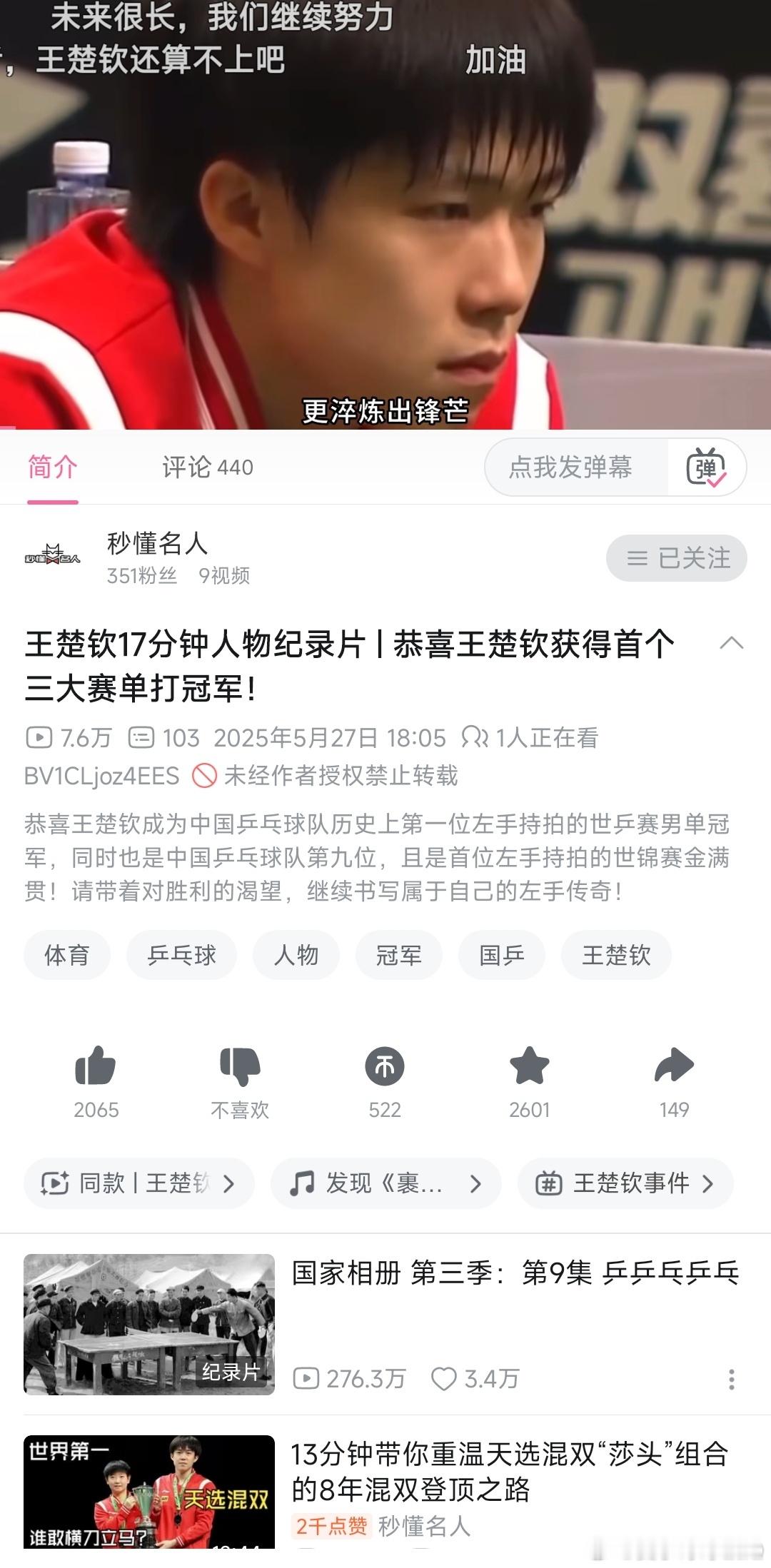 王楚钦包揽男单、男双、混双三项冠军背后我们看到的是一个顶级运动员披荆斩棘的成长之路!破站up秒懂名人,用17分钟纪录分享了“三冠王“的来时路。关注王楚钦技术的朋友,可以看站内另一位up不凡体育对其正反手