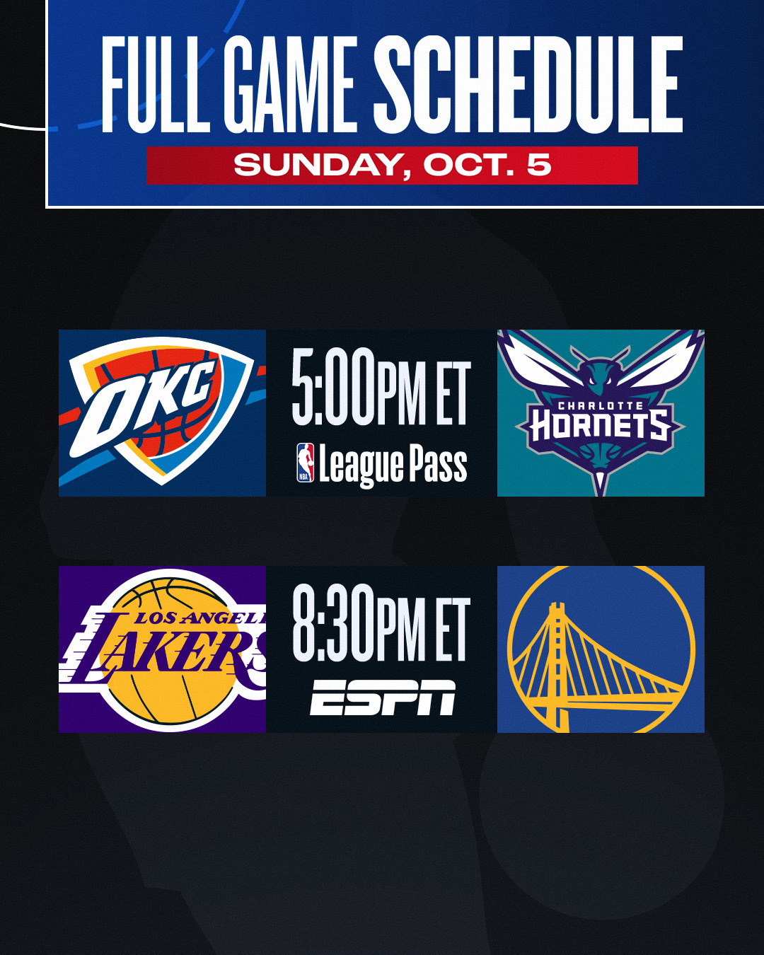 明天2场NBA季前赛,雷霆vs黄蜂、湖人vs勇士,记得关注。