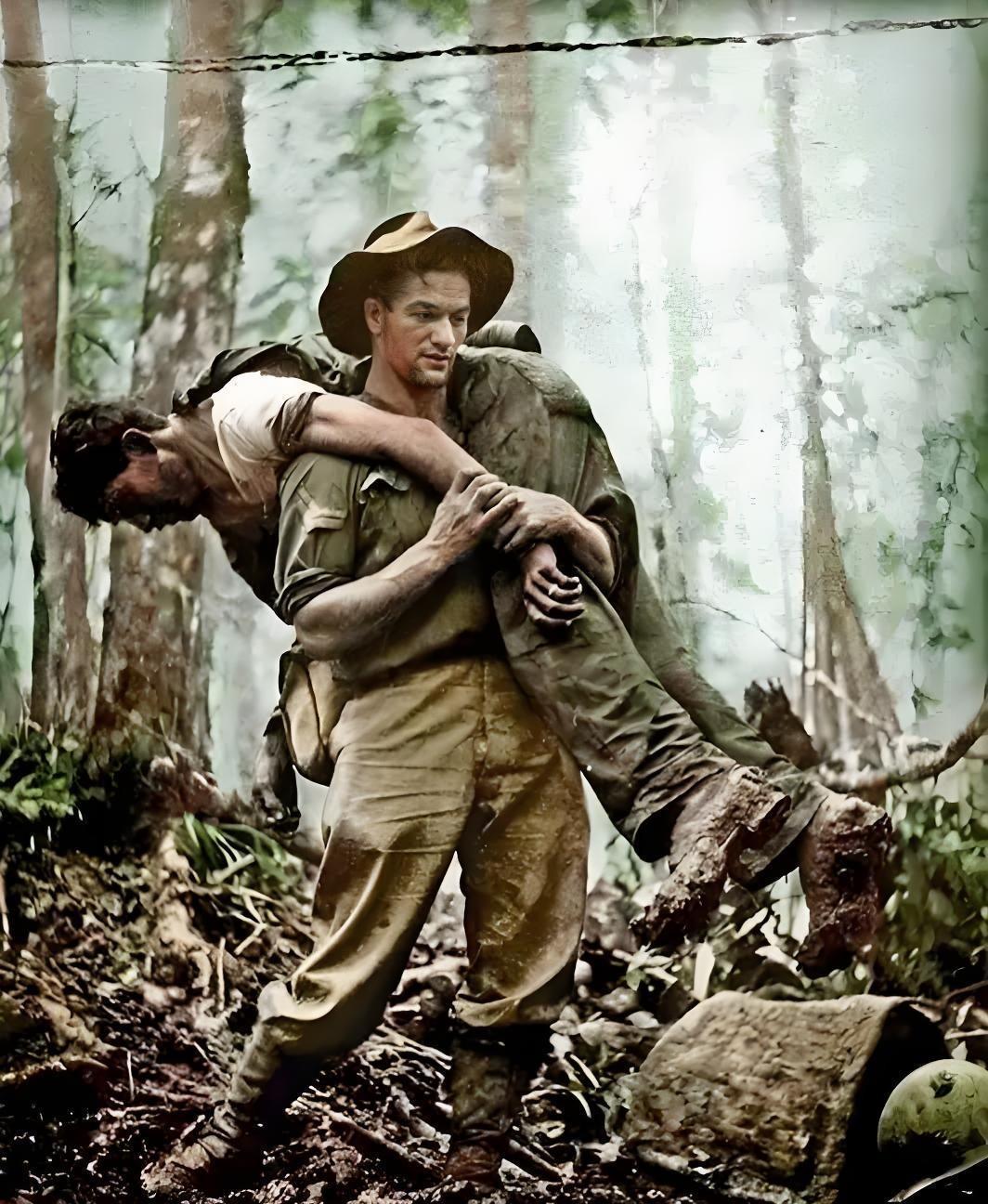1943年,二战时期,在新几内亚战役中,一名澳大利亚下士莱斯利( Leslie ),从死人堆里扒出受伤的战友扛向数公里外的战场临时救护所,他仅凭一己之力救出了12名美军士兵,因此,被授予银星勋章。真是勇敢的军人!#牢记历史爱我中华# #分享真实的历史#