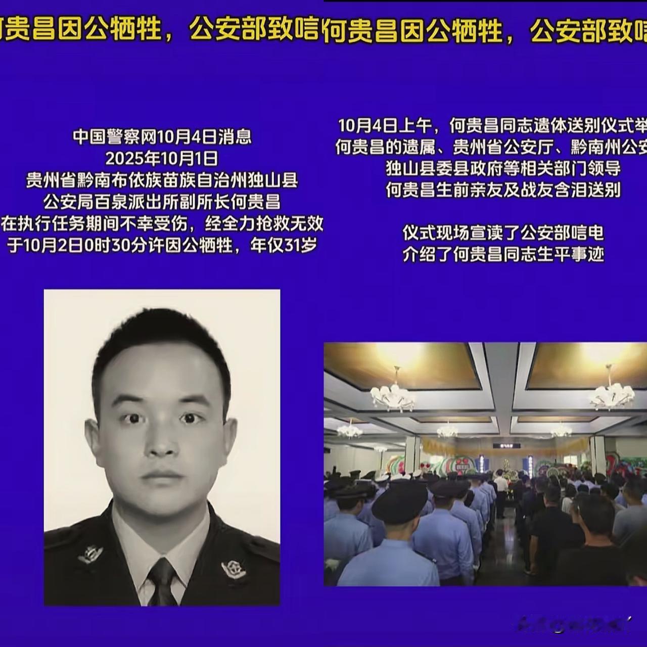 不查不知道 一查全是料 贵州31岁派出所副所长何贵昌700次冲在危险前,他的名字应该被铭记! 刷到何贵昌的事迹时,手里的手机都攥紧了——这个31岁的贵州派出所副所长,国庆当天还在执行任务,10月2日就永远离开了,连公安部都专门发来唁电送别。 2017年穿上警服起,他在基层守了7年:办1000多起案子、700次直面歹徒,硬生生帮群众抢回500多万损失。两次嘉奖、一次三等功的证书压在抽屉里,可每次有危险任务,他总说“我来”,把同事护在身后。 直到牺牲,他办公桌上还摊着没写完的案卷,手机里存着给云南老家父母的未拨通话——上次视频时,他还笑着说“忙完这阵就回家”。我们过节的平安,从来都是他这样的人用“不回家”换来的,每年两三百名民警辅警因公牺牲,他们的名字不该被忘记。 何贵昌的故事值得被更多人看见。你愿意和我一起,再跟这位英雄说句“一路走好”吗?何贵昌