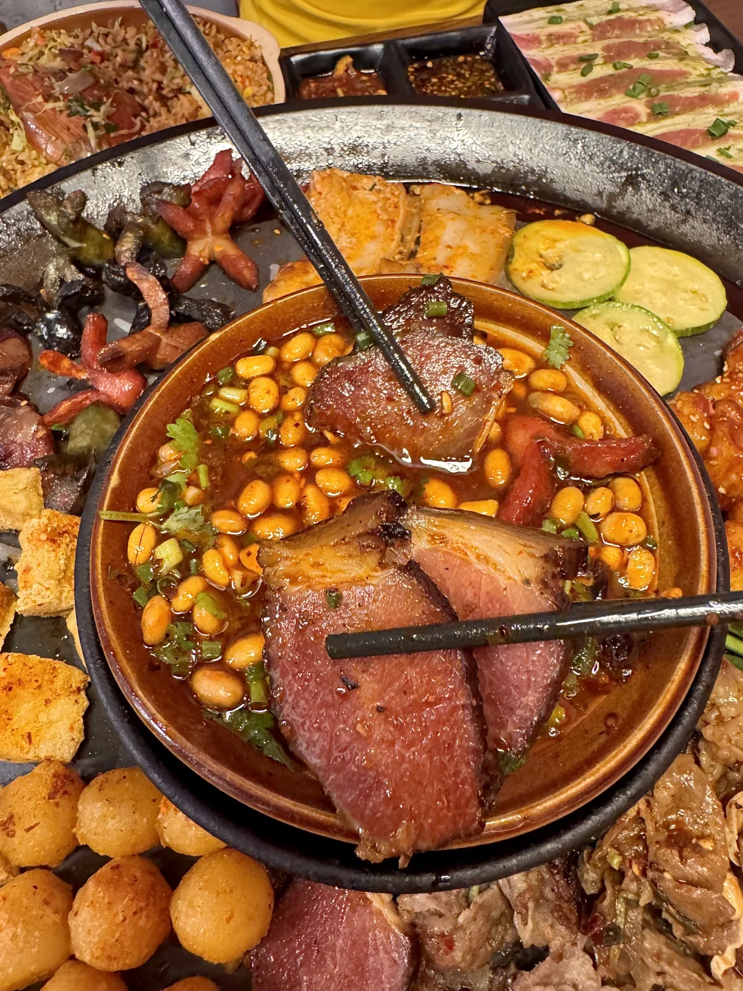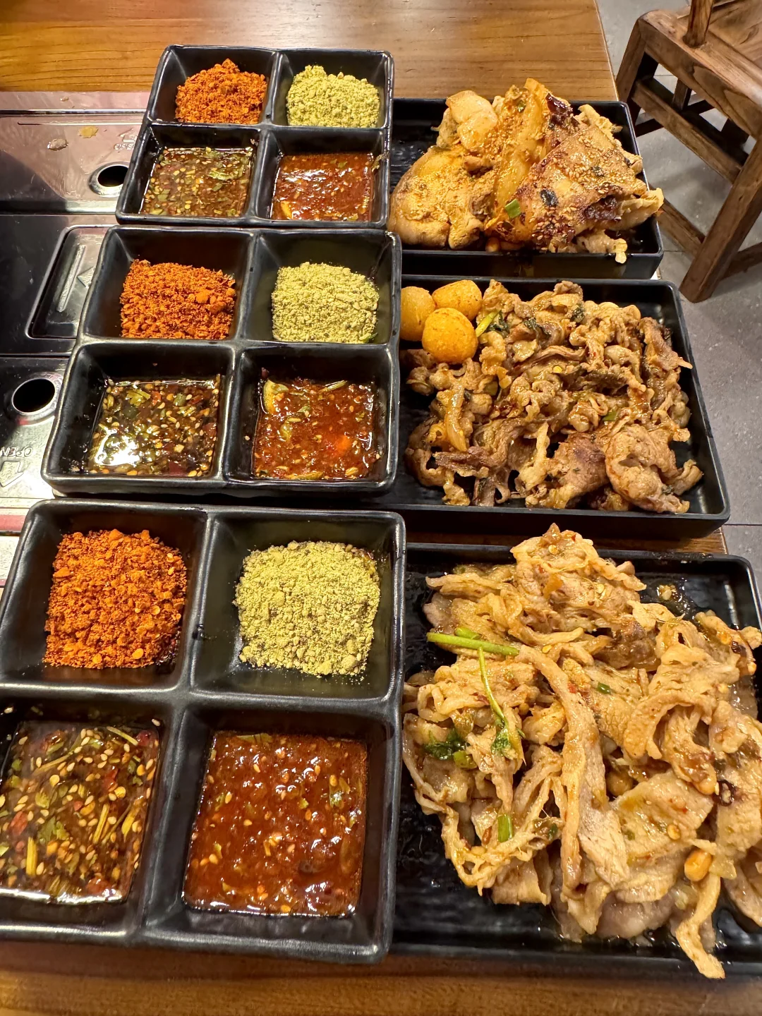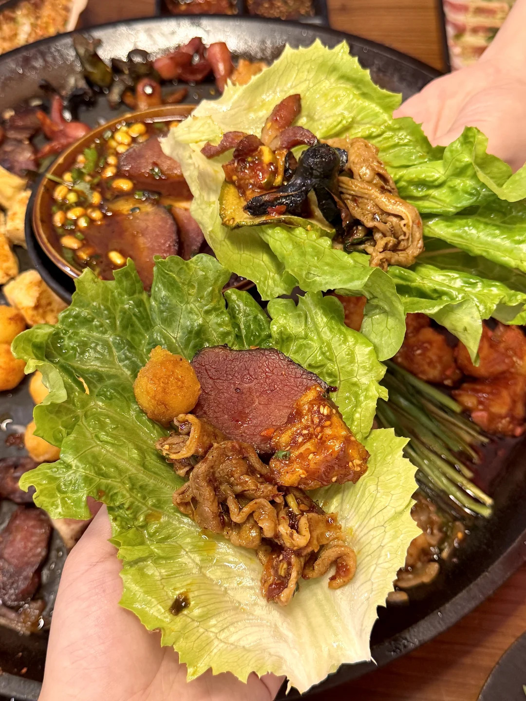 好好吃啊😭近期在上海吃到最满意一顿!贵州烙锅!就在静安寺附近!叫📍朱小凡)活油蘸水真的蘸鞋底都好吃🤤推荐牛肉、五花、腊味拼盘…烤得滋啦作响!包生菜也是一绝