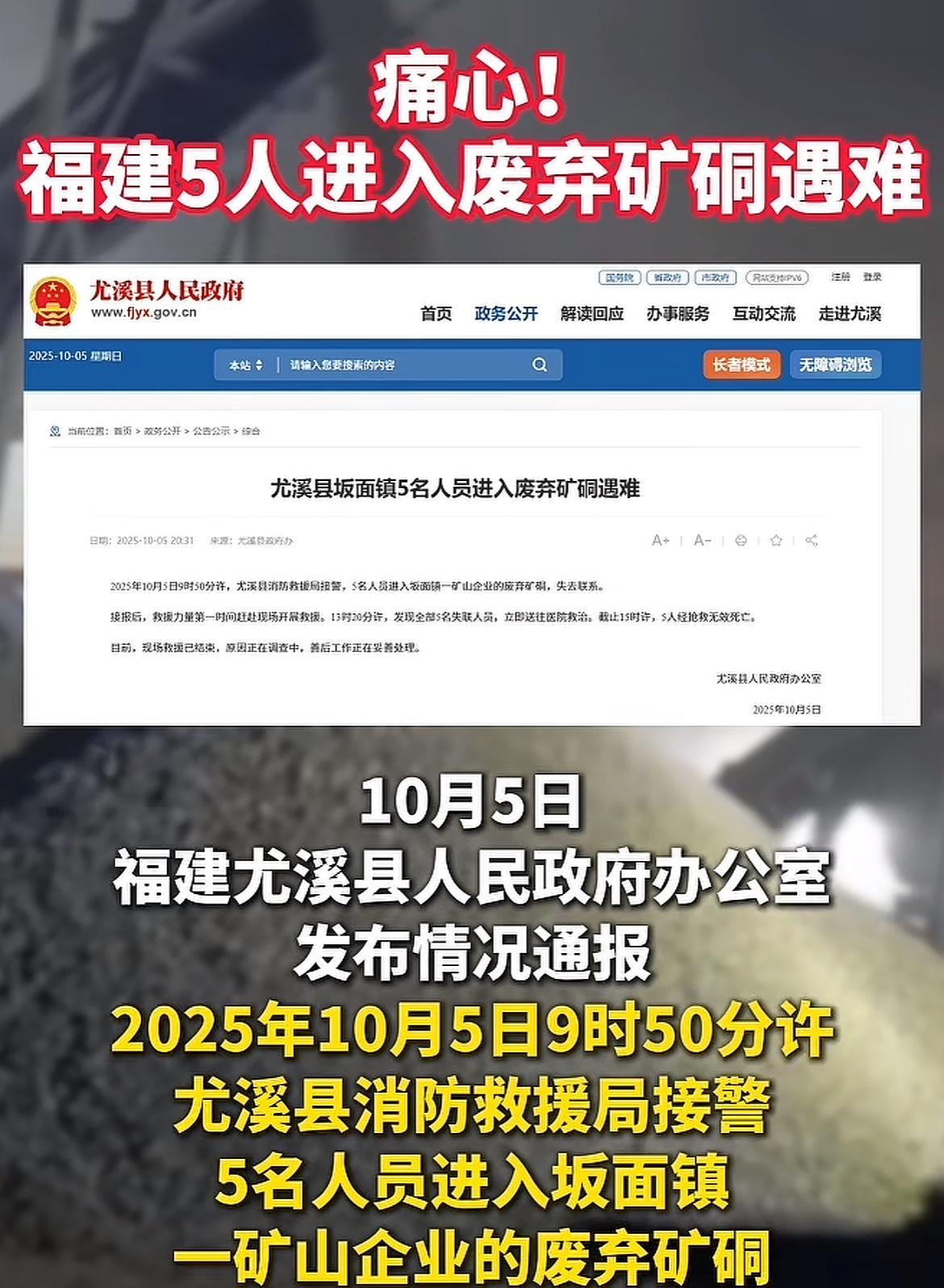 突发惨剧,5人死亡,10月5日上午10点左右,尤溪县坂面镇进入废弃矿硐后失联,下