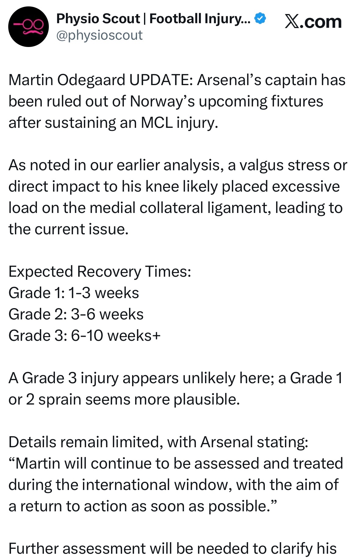 阿森纳队长因内侧副韧带受伤,将确定缺席挪威国家队的接下来的比赛。正如我们早前分析所指出的,膝关节遭受的外翻应力或直接撞击很可能对其内侧副韧带造成了过度负荷,从而导致了当前的问题。