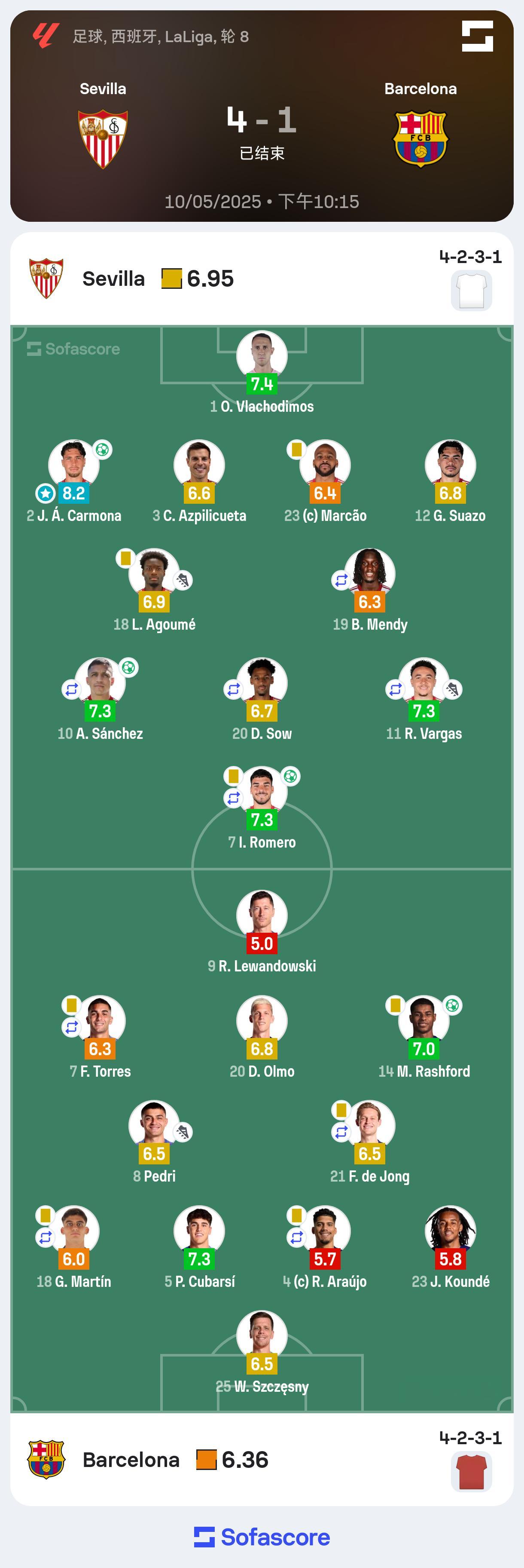 塞维利亚4比1巴萨 全场比赛评分……莱万多夫斯基只有5分😔😔😔😔热点现场巴萨