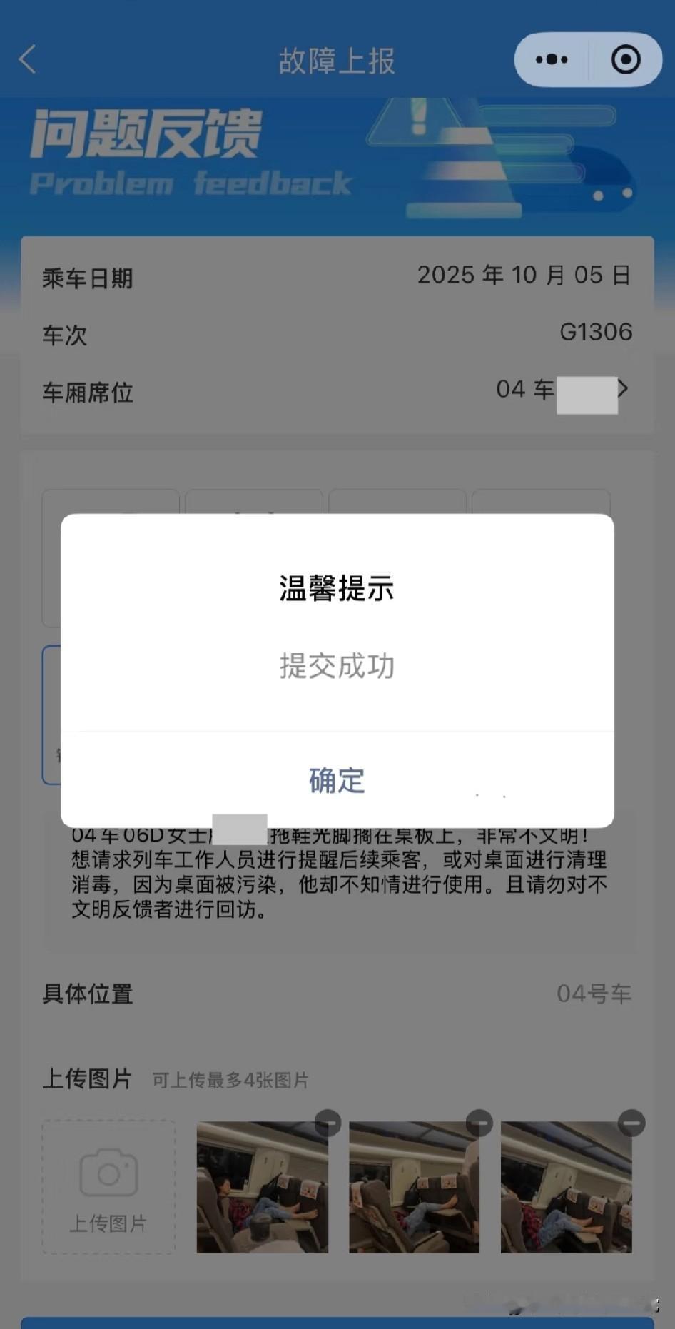 12306不文明反馈秒见效! 国庆坐G1306次高铁,亲眼撞见光脚搁桌的“奇葩操作”,抱着试试的心态用12306反馈,没想到列车员火速到场处理!咱大中国的高铁不仅速度快,治理不文明的“响应速度”更绝! 从忍气吞声到一键维权,这届网友终于能在公共场合挺直腰杆。可反过来想,要是人人都得靠“反馈”才能守住文明底线,那咱们离真正的自觉文明,是不是还隔着一段“高铁加速”的距离?