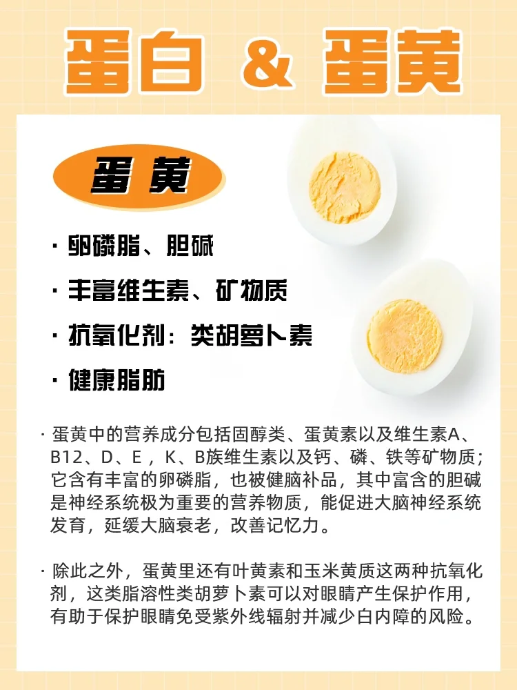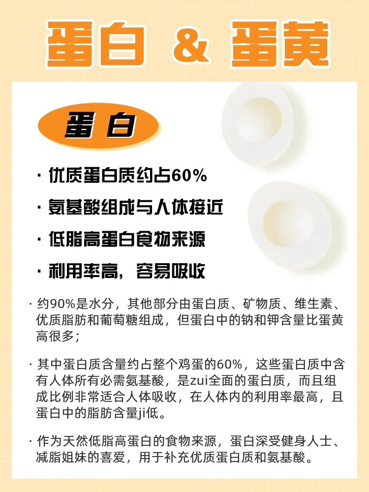 一个完整的鸡蛋,富含优质蛋白质、优质脂肪、维生素、矿物质、人体必需的8️⃣种氨基酸,以及独特的抗氧化剂以及大脑营养素。那么到底究竟食用蛋黄还是蛋白更健康❓它们之间的营养成分又有什么区别呢[暗中观察R]