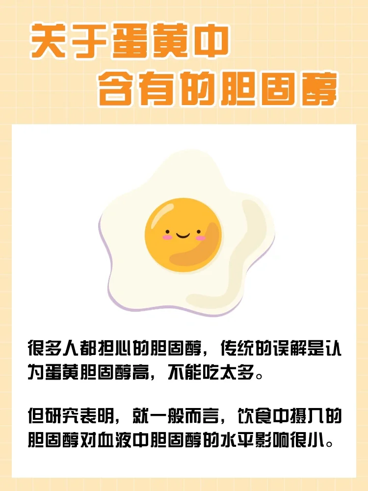 📝至于很多人都担心的胆固醇,传统的误解是认为蛋黄胆固醇高,不能吃太多。但研究表明,就一般而言,饮食中摄入的胆固醇对血液中胆固醇的水平影响很小。