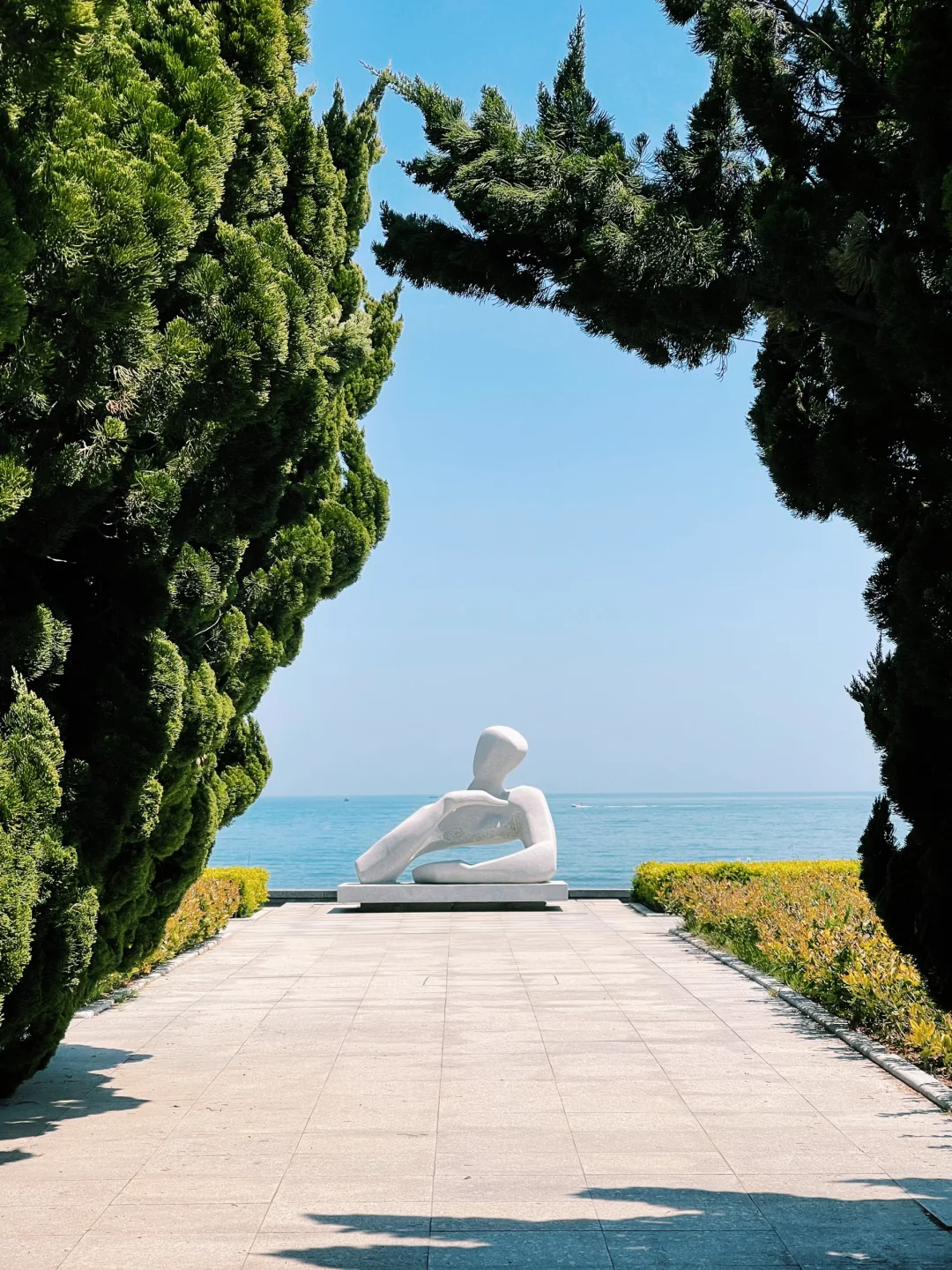1⃣️松柏迷宫:翠绿的松柏构成水上迷宫,尽头是大海🌊,随手一拍都很出片,靠近海边的两排,是雕塑园标志性打卡点,比小麦岛的两棵树更好拍哦〰️