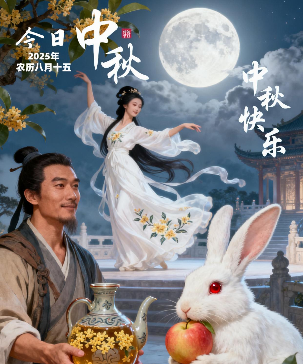 朋友:中秋节快乐! 花好月圆夜,中秋情更浓。神话故事更激励人们对美好生活的向往。 《中秋同欢》 皓魄清辉满玉盘,人间佳节又团圆。 吴刚捧出桂花酒,玉兔携来仙果鲜。 嫦娥又舞影蹁跹,广寒宫里亦欣然。 今宵共赏团圆月,同贺中秋喜乐绵。