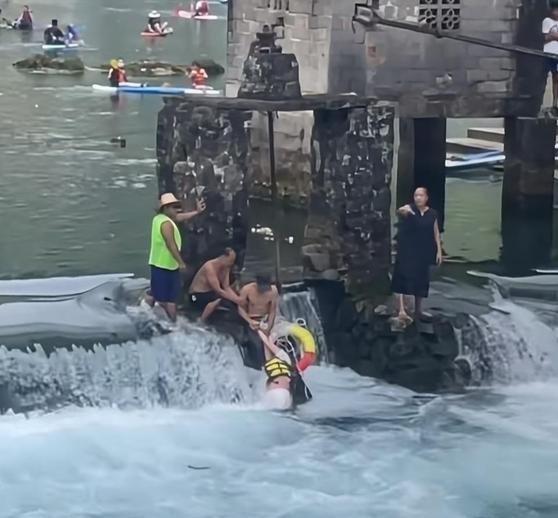 《广西九顿天窗一女游客落入滚水坝被村民救起,当事人:漩涡里翻转了十几下,像和死神打了一仗》很快,三位村民赶来救援,他们先将救生圈套住女孩,将其拖至安全区域,随后转向救援吴女士。网页链接
