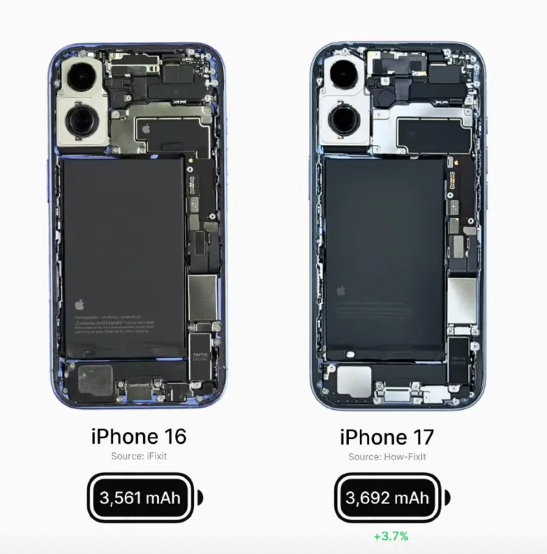 iPhone16和17内部结构差异不小。性能上,芯片是大升级,17标准版用A1