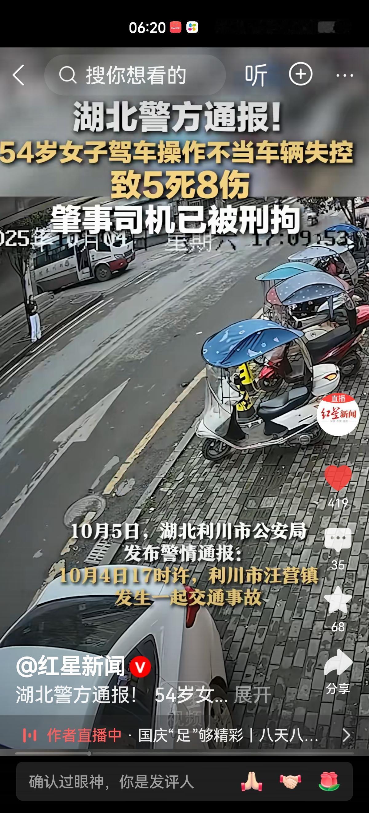 天有不测风云,人有旦夕祸福。双节假期的第4天,湖北利川市汪营镇发生一起交通事故,事故原因是54岁的女驾驶人因操作不当导致车辆失控。监控画面显示,肇事车辆快速冲过路面,前方斑马线有行人路过。这次交通事故已致5人死亡,8人受伤。 汽车的普及,让全民都可以成为驾驶者,在享受生活便利的同时,也会带来一些安全隐患。如今大街上的驾驶者,虽然都是有驾驶证的合法驾驶者,但这些人的驾驶技术却是良莠不齐,说不定其中就有潜在的马路杀手。谨慎驾驶不应该直挂在嘴边,要刻进驾驶者的脑子里,因为这是对生命的敬畏!
