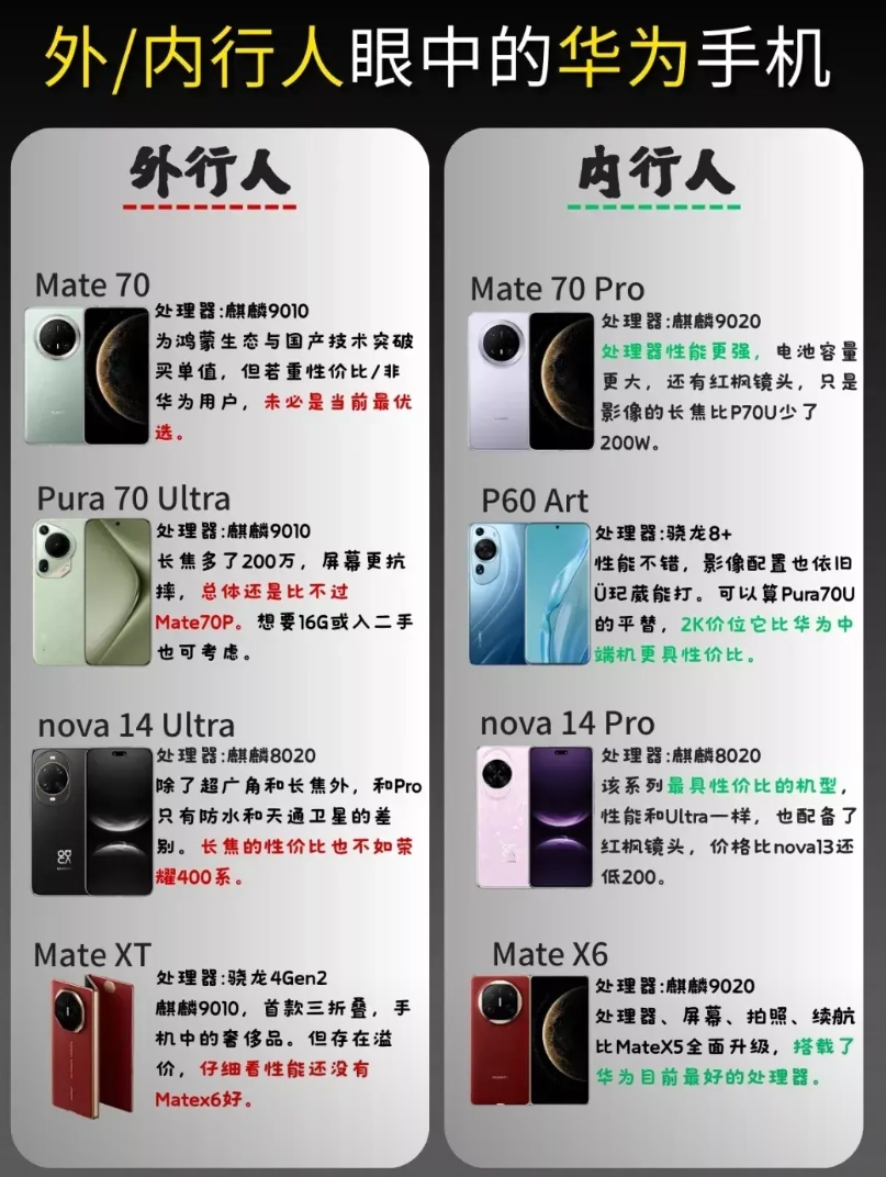 炸锅!外行人vs内行人看华为手机,差距大到离谱!Mate 70 外行人觉得为生态买单,内行人盯准 Mate 70 Pro 更强性能;Pura 70 Ultra 外行人看长焦,内行人对比 Mate70P …… 从处理器到性价比,门道超多!你买华为时,是看外行热闹还是懂内行门道?难道手机的 “隐藏剧本”,就这么藏在内外行眼里啦?