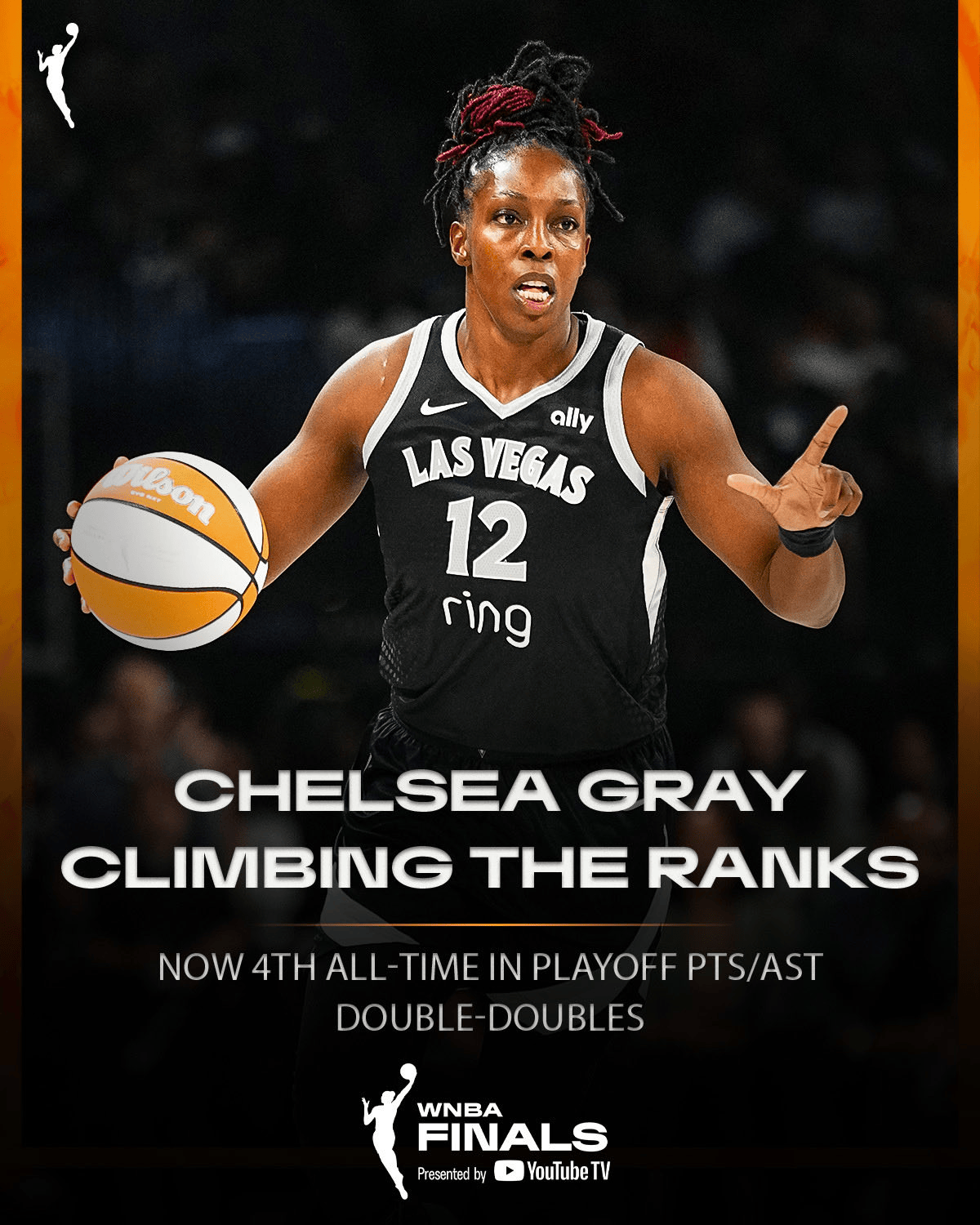 WNBA官方分享数据:切尔西-格雷季后赛生涯得分/助攻两双次数升至历史第四。