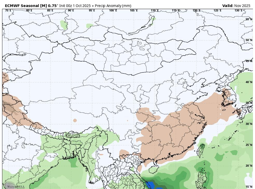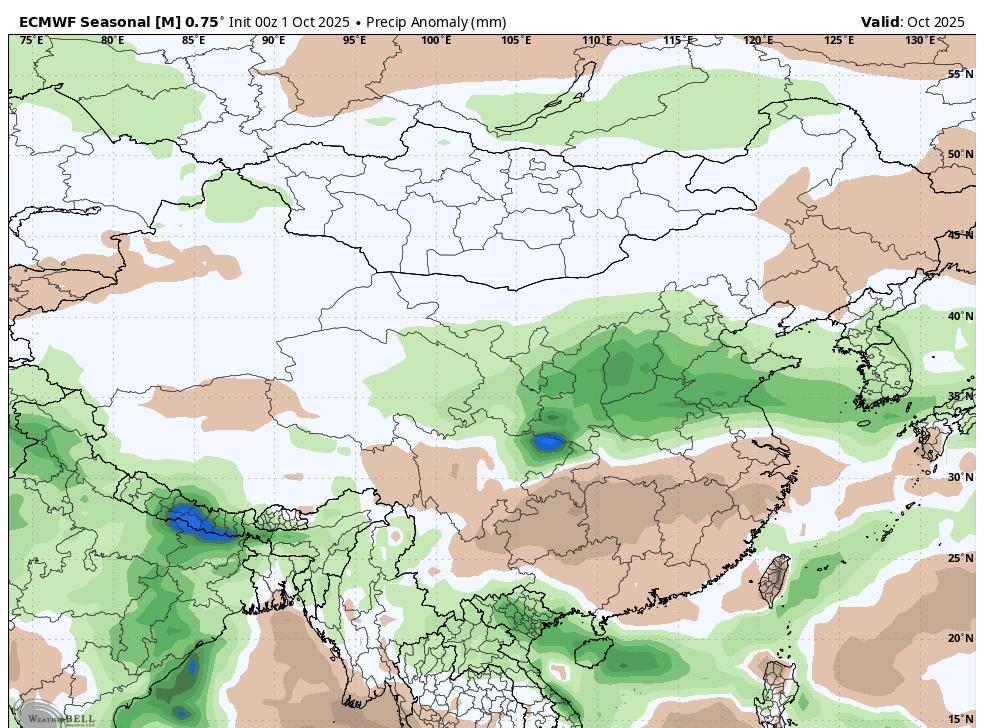 10月,华西北部至华北黄淮整体多雨,降水显著偏多。而在副高控制下,长江以南依旧是