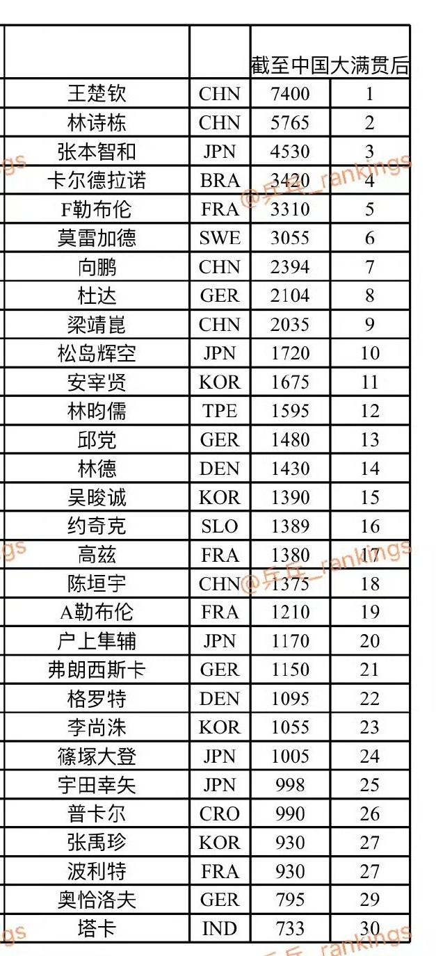 男单选手入围国际乒联2025香港年终总决赛的即时积分榜! 此积分榜截止时间为20