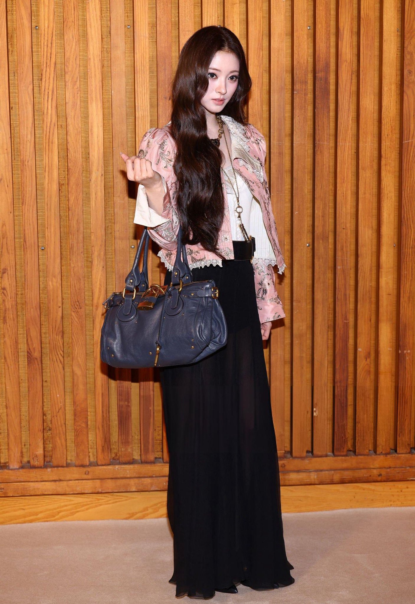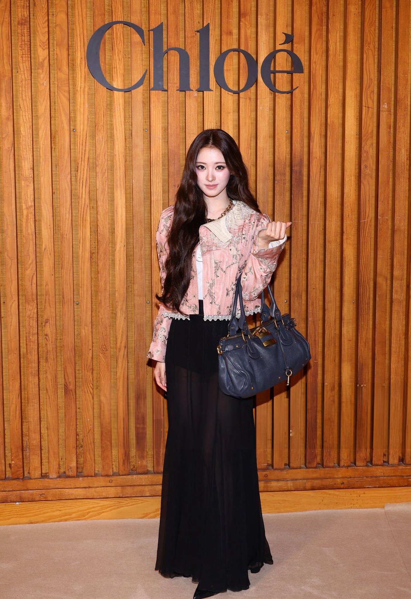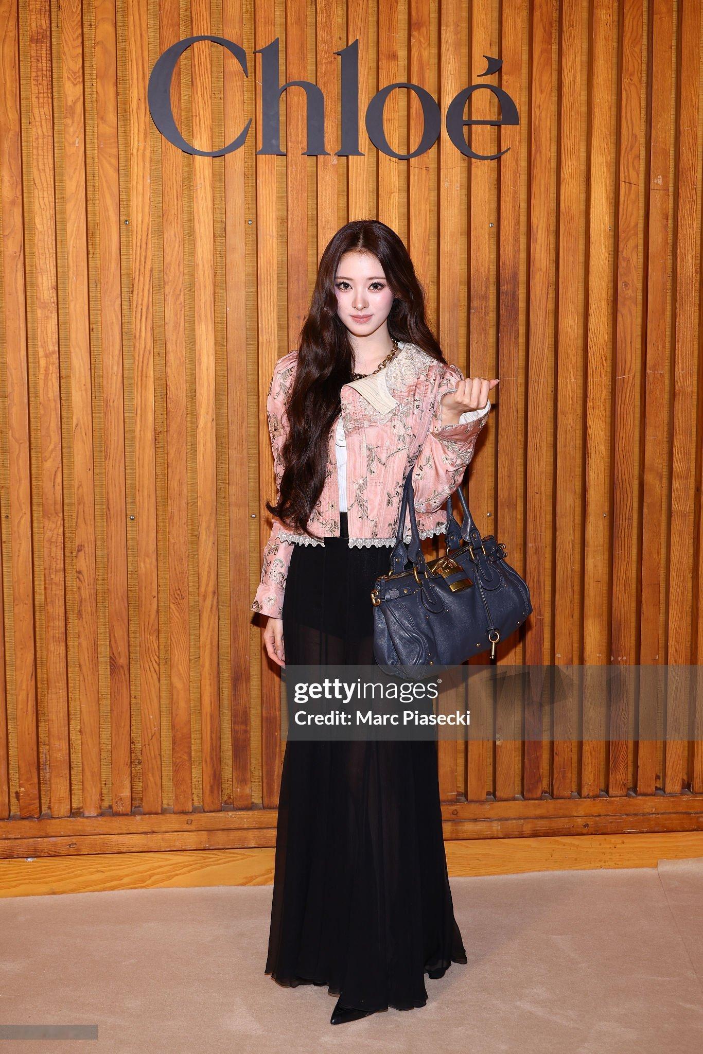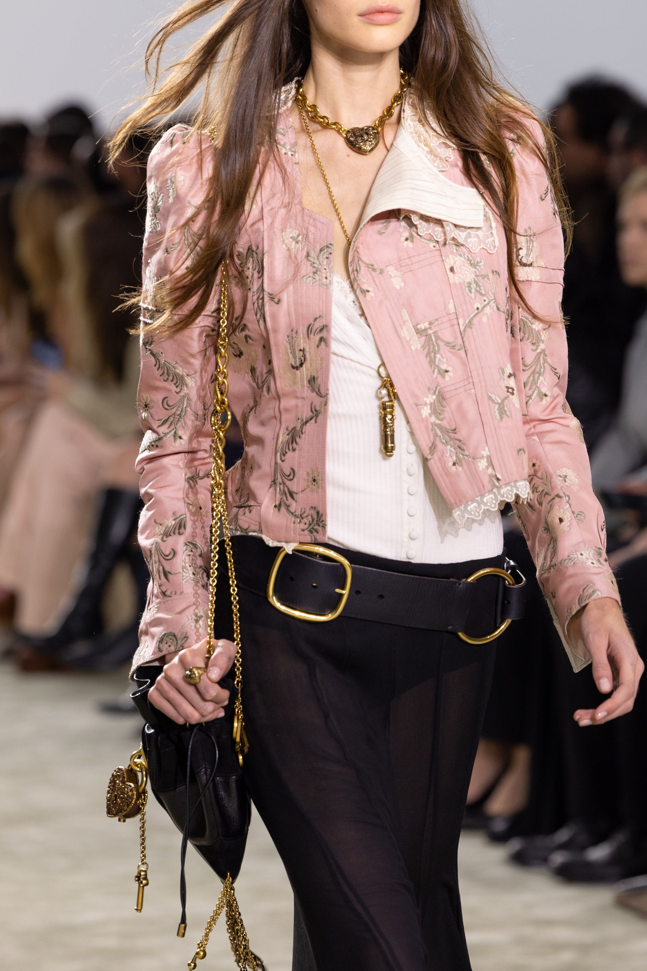 看秀Look来自2025秋冬系列,花卉元素的粉色夹克外套搭配黑色透视半身裙,非常聪明将秀场Look的高跟凉鞋换成尖头包脚高跟鞋,使整个造型温柔又更显利落干练,她与CHLOÉ适配度是真高👏