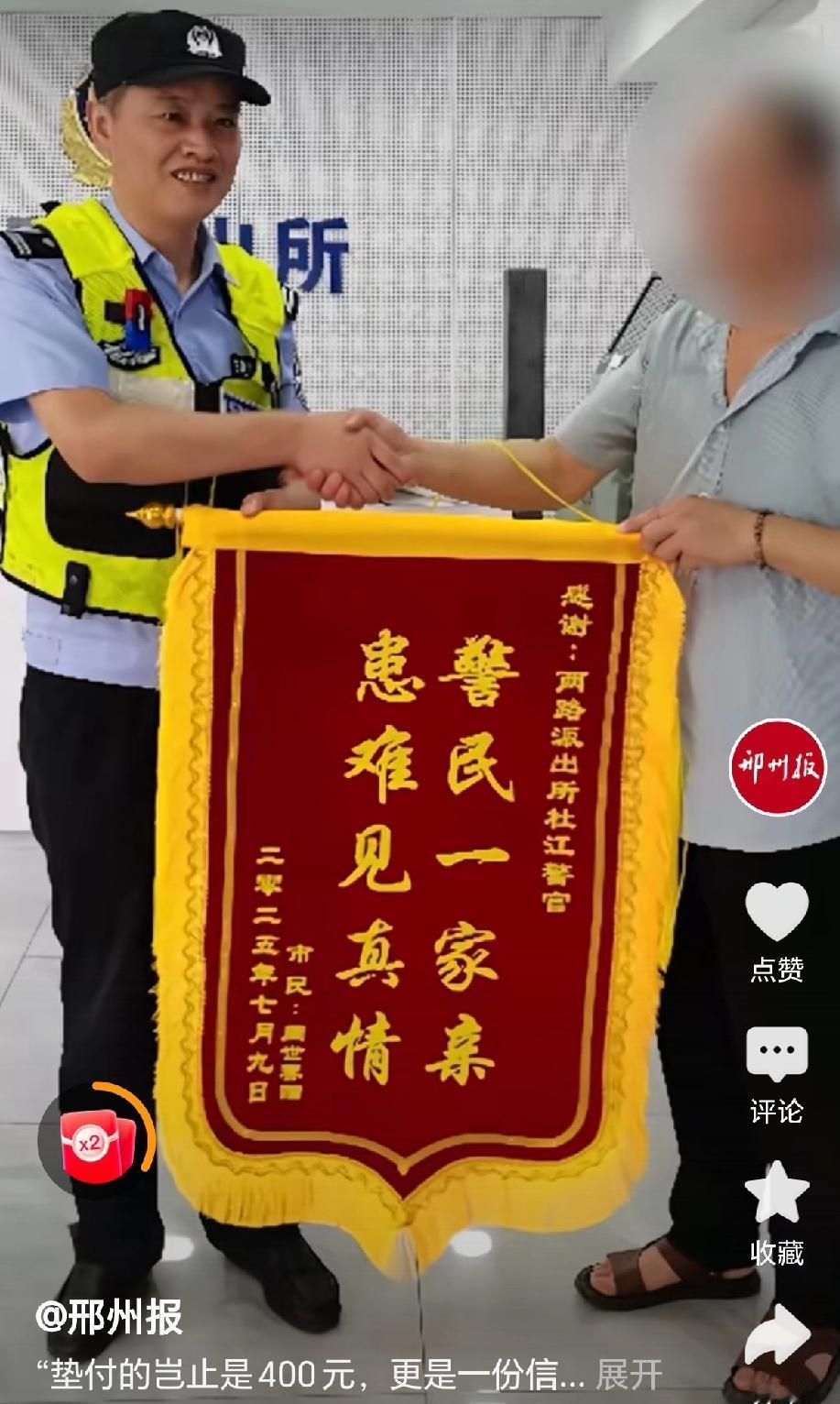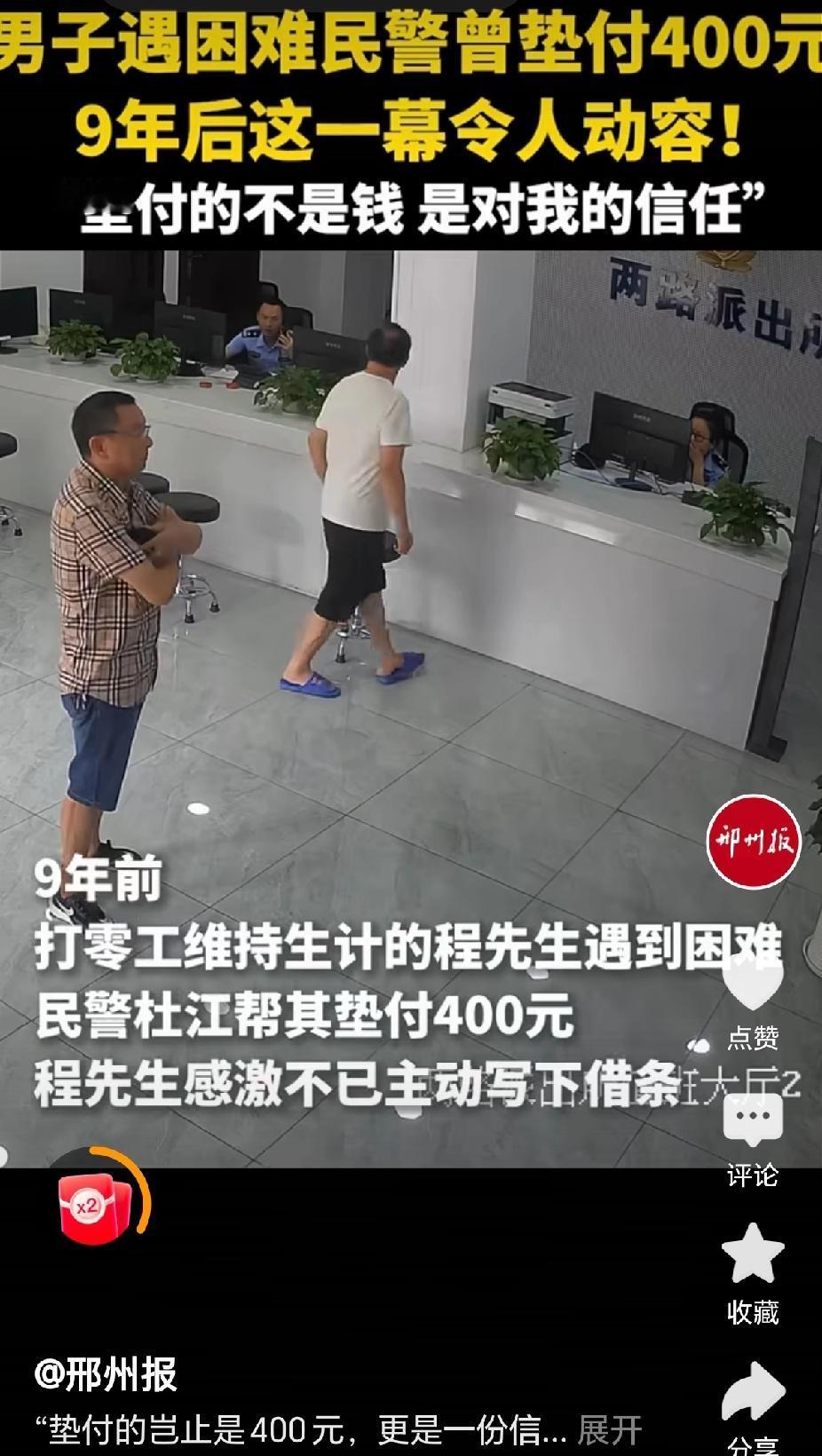 “动容了,民警9年前垫付400元,男子9年后前来兑现借条!”近日,重庆渝北,两路派出所接到一面警旗写道“感谢杜江警官,警民一家亲、患难见真情!”(来源:@邢州报) 据视频报道,这件事情还得从九年前说起。九年前在重庆打工的周先生,遇到了生活的困难,不得不求助警察。 两路派出所民警杜江了解情况后,主动帮其垫付了400元。周先生为此郑重地写下了借条,并对杜警官说,“只要我条件好转,就一定会还钱。” 这件事一晃过去了九年,杜警官也早已忘记了。而周先生却将此事一直铭记在心,努力的改善自己的生活。 到今年7月份,周先生觉得自己的生活有很大的改善,来回的车费也不是问题了,是就动身来到两路派出所寻找恩人杜警官。 “你都还能够想起这件事,我觉得是很难得的事情,你不来我都忘记了这事情了!”在视频中,杜警官说道。 “您帮助的不仅是400元,更是对我的信任,是对我全家的雪中送炭和支持!”周先生还特意制作了锦旗前来感谢! “能够记得帮助过你的人,并且还付出行动去兑现承诺和表达,感谢是好样的!”有网友评论说,况乎,九年之久,值得表扬,愿今生再无坎坷! “这是为人民服务的好警官!”有网友说,群众遇到困难伸出援助之手,杜警官真是一个热心做人的好民警。 是呀,警民鱼水情,在这件事上表现的淋漓尽致,谁将群众放在心上,群众就将你记在心里。 作为我们老百姓,也需要常怀感恩之心,常记承诺和诚信,不抛弃,不放弃,努力活出自己精彩的人生!愿今生再无坎坷! 对此,你的看法是怎样的呢? 诚信 男子遇困难民警垫付400元 @秋实99 关注人生冷暖,拥抱幸福生活!
